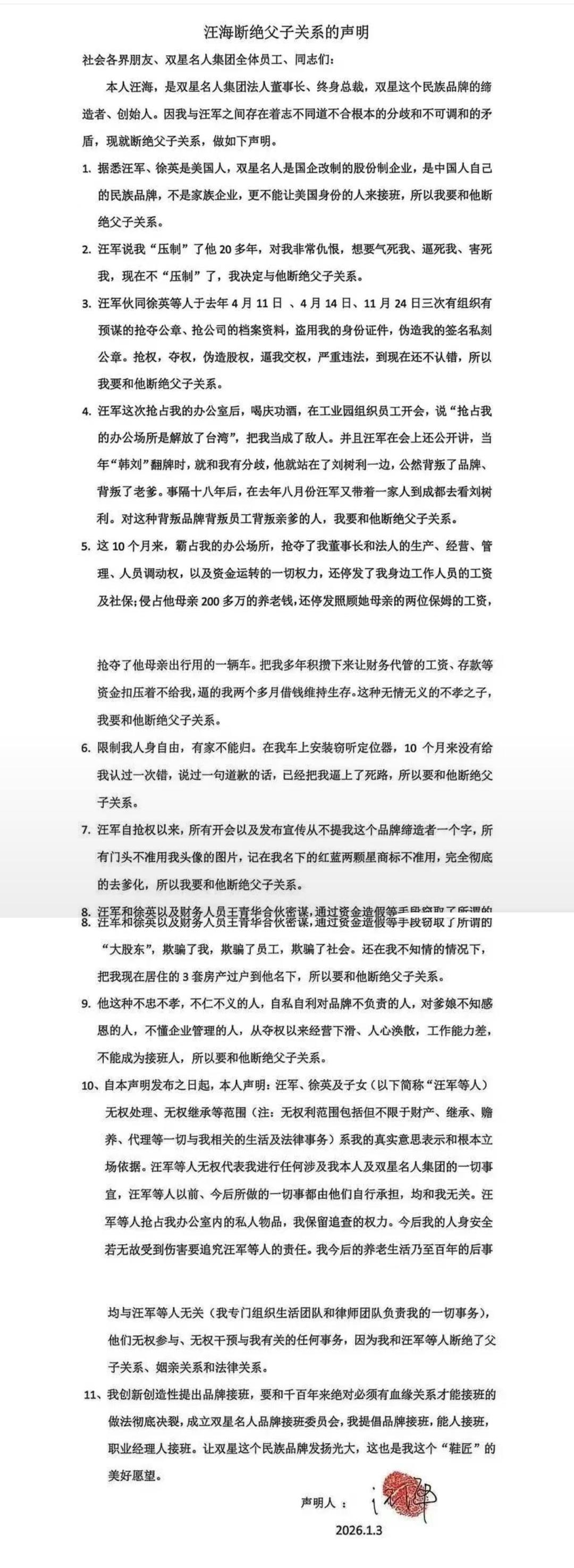 84岁双星名人创始人汪海声明与儿子、儿媳断绝关系!列举11条理由,称中国人的民族品牌,不能让“美国身份的人”接班。 2026年开年,围绕百年鞋企双星名人的控制权争夺,演变成了彻底的决裂。 近日,汪海公开发布声明称,与儿子汪军、儿媳徐英断绝关系,并将“美国身份不得接班民族品牌”列为首要理由。 这场家族纷争实则源于企业控制权之争——2022年儿媳控股公司已成为集团大股东,汪海逐渐失实权,随后双方从“公章争夺”升级至公开决裂。汪海在声明中强调打破“血缘接班”,推动职业经理人接管。 面对亲情崩塌,汪海在声明最后祭出“杀手锏”:彻底打破“血缘接班”的传统。他宣布将成立“双星名人品牌接班委员会”,主张“能人接班”和“职业经理人接班”。 目前,徐英一方虽在股权上占优,但随着汪海死守法定代表人身份并诉诸法律,这场围绕百年鞋企的控制权之争,短期内恐难画上句号。