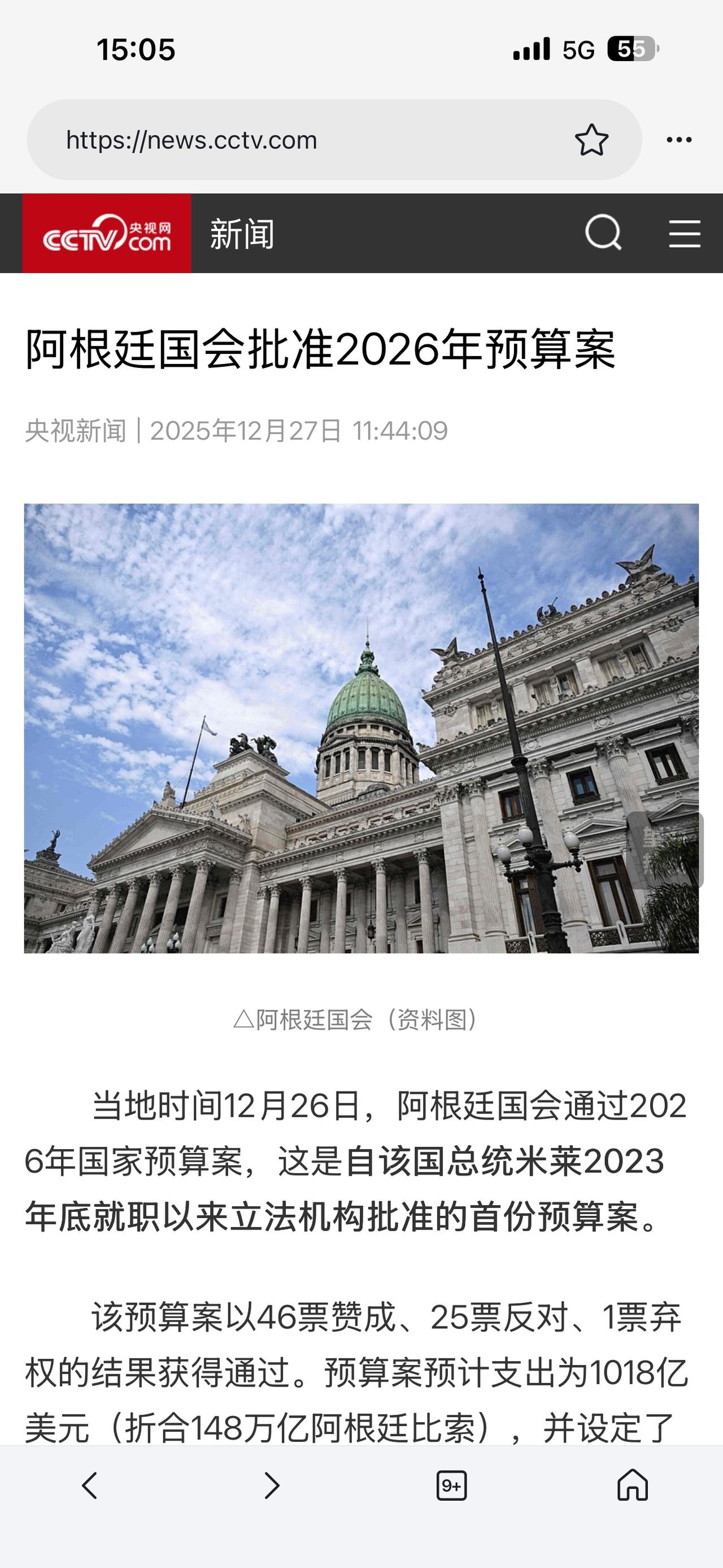 阿根廷把政府勒紧裤腰带苦过日子,写进未来三年的政府法律文件! 2025-12-27央视新闻报道:阿根廷国会以46票赞成、25票反对、1票弃权的结果通过了米莱政府的2026财政预算。 该预算的目标是:设定了5%的国内生产总值增长目标和10.1%的年通货膨胀率预期。同时,米莱把2026年政府支出,从2025年占GDP总值的3.4%降到1.8%,进一步实施他的紧缩财政支出的政策。 对于此项方案的通过,阿根廷大部分民众表示支持,而政府部门、事业单位等靠财政支出过日子的人则表示“失望、遗憾”! 据悉,这是米莱非常关键的一次和国会的对决,意味着他在未来三年能否继续贯彻其执政方针!