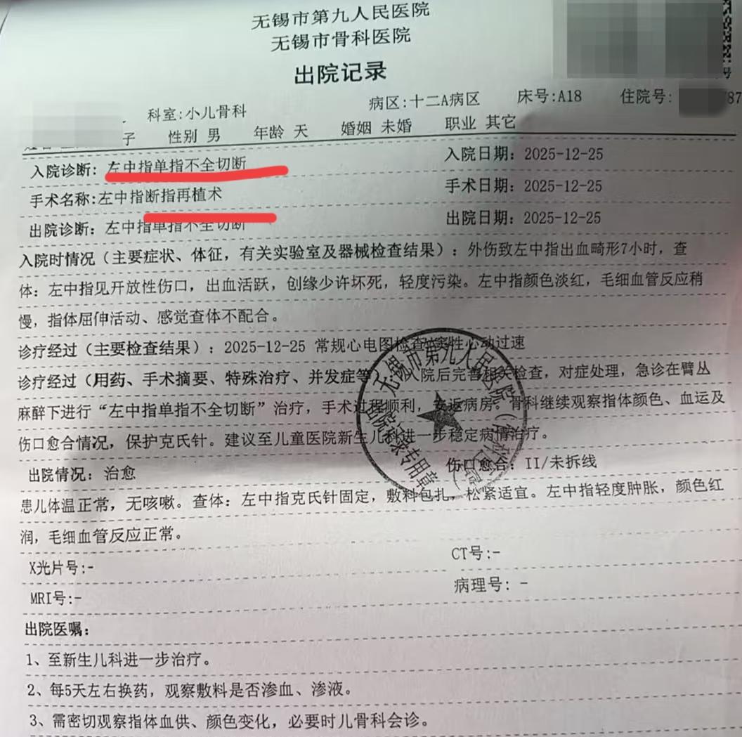 江苏盱眙县一新生儿被手术剪剪断左手中指,刚来世间的孩子遭罪了啊! 应该是剪脐带的时候,宝宝伸手过来抓,助产士没仔细观察就下手剪了。 新生儿手关节都是分开的,医疗器械也比家用的剪子锋利,才造成这么严重的后果。 孩子父亲接受采访时说,孩子出生当天两次转院,到无锡人民第九医院已经将手指接上了。 接生的那家医院也在全力配合孩子治疗,跟家属协商,等孩子恢复一段时间后再谈赔偿。