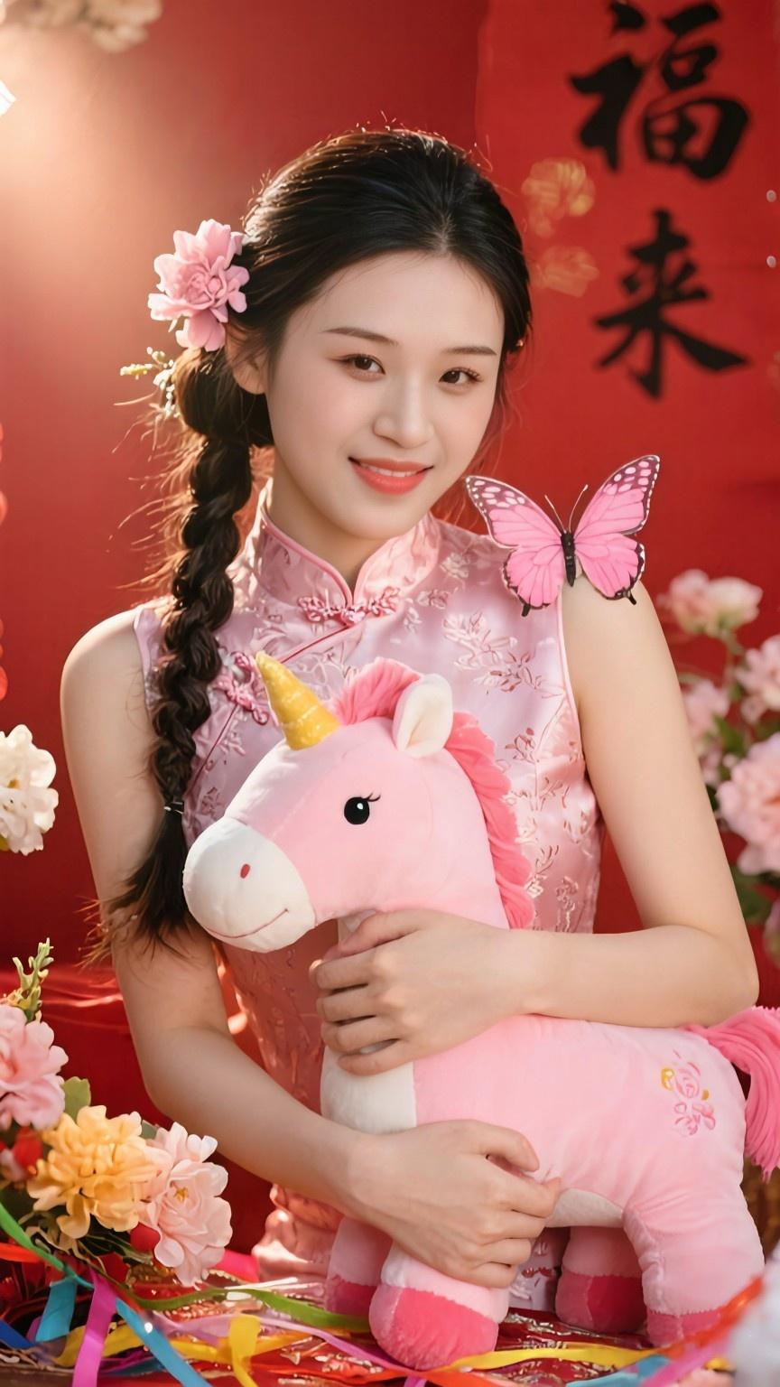 粉缎裁衣衬雪肌, 青丝漫卷惹风怡。 回眸一笑春光里, 半绾温柔半带痴。 精致女神