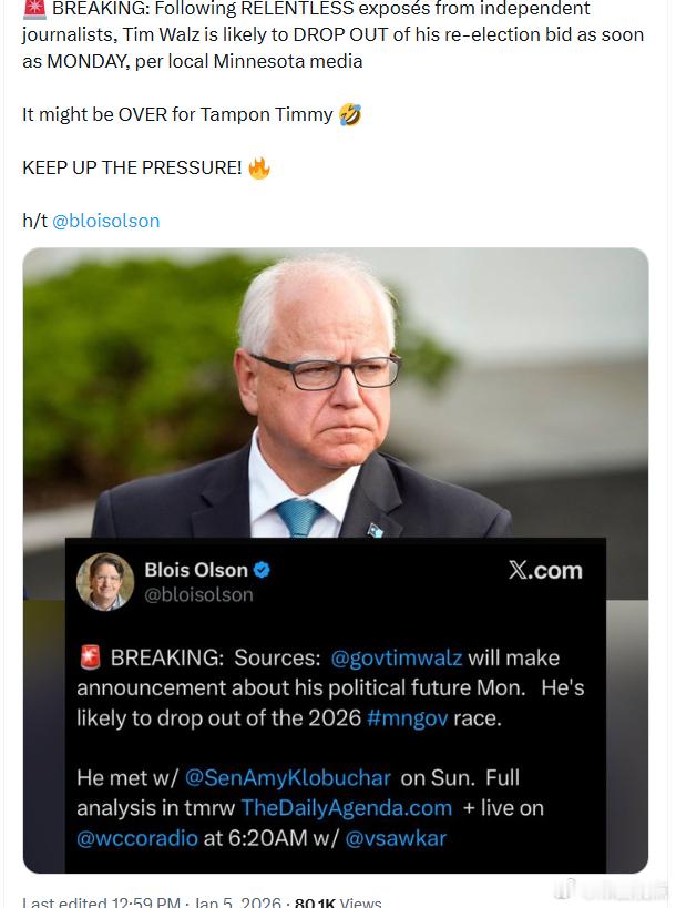 据明尼苏达州当地媒体报道,在独立记者持续不断的揭露之后,蒂姆·沃尔兹很可能最早在周一就会退出他的莲荏竞选。“卫生棉条蒂米”(Tampon Timmy)可能要完了。