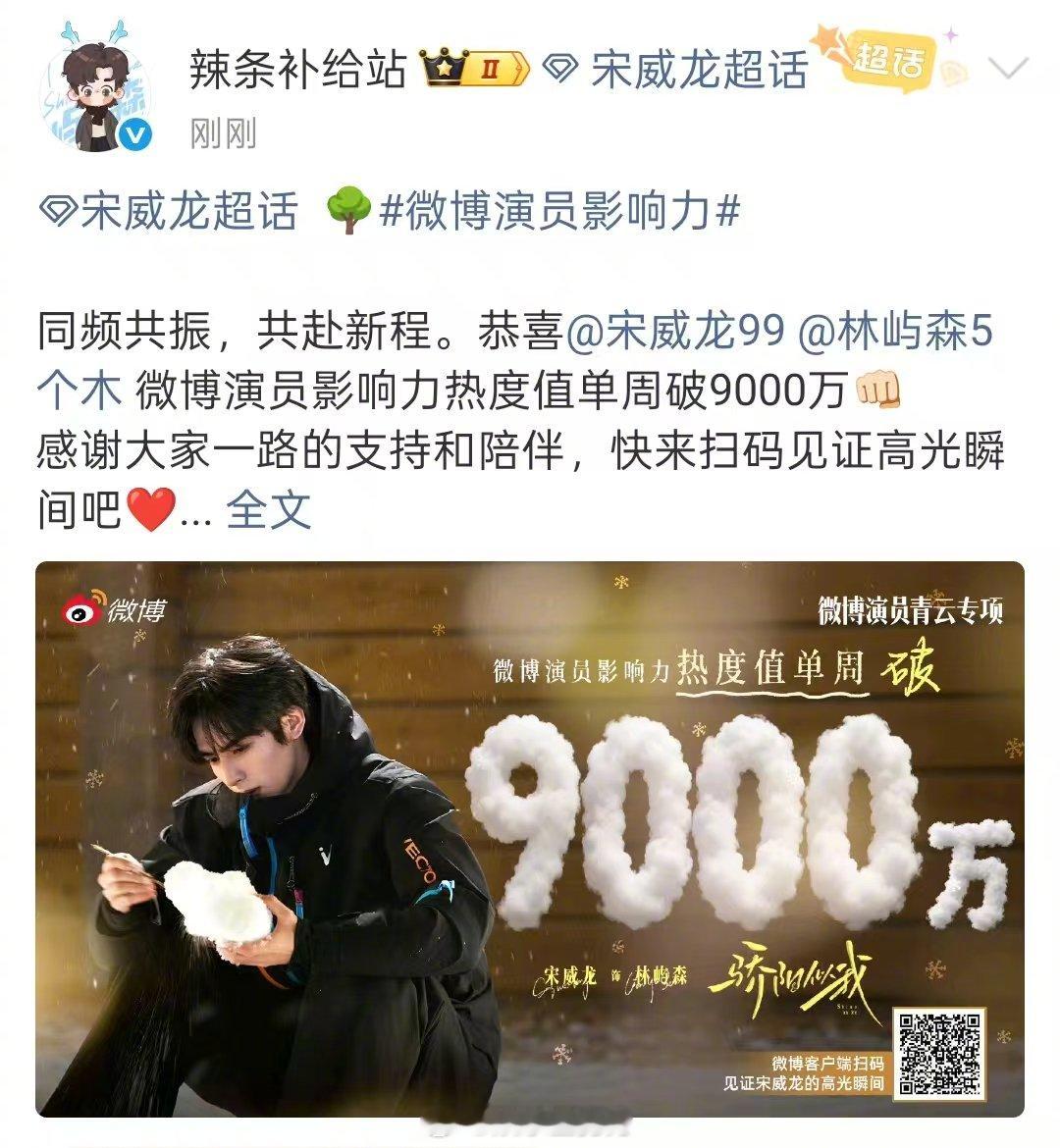 宋威龙微博演员热度值单周破9000万 恭喜宋威龙单周热度值突破9000万!他演绎的林屿森,以“清冷开场”到“温柔深陷”的极致反差深入人心,将角色内心的破茧成蝶过程刻画得富有层次。高热度即是对其“纯爱系”完美演绎的高度认可。