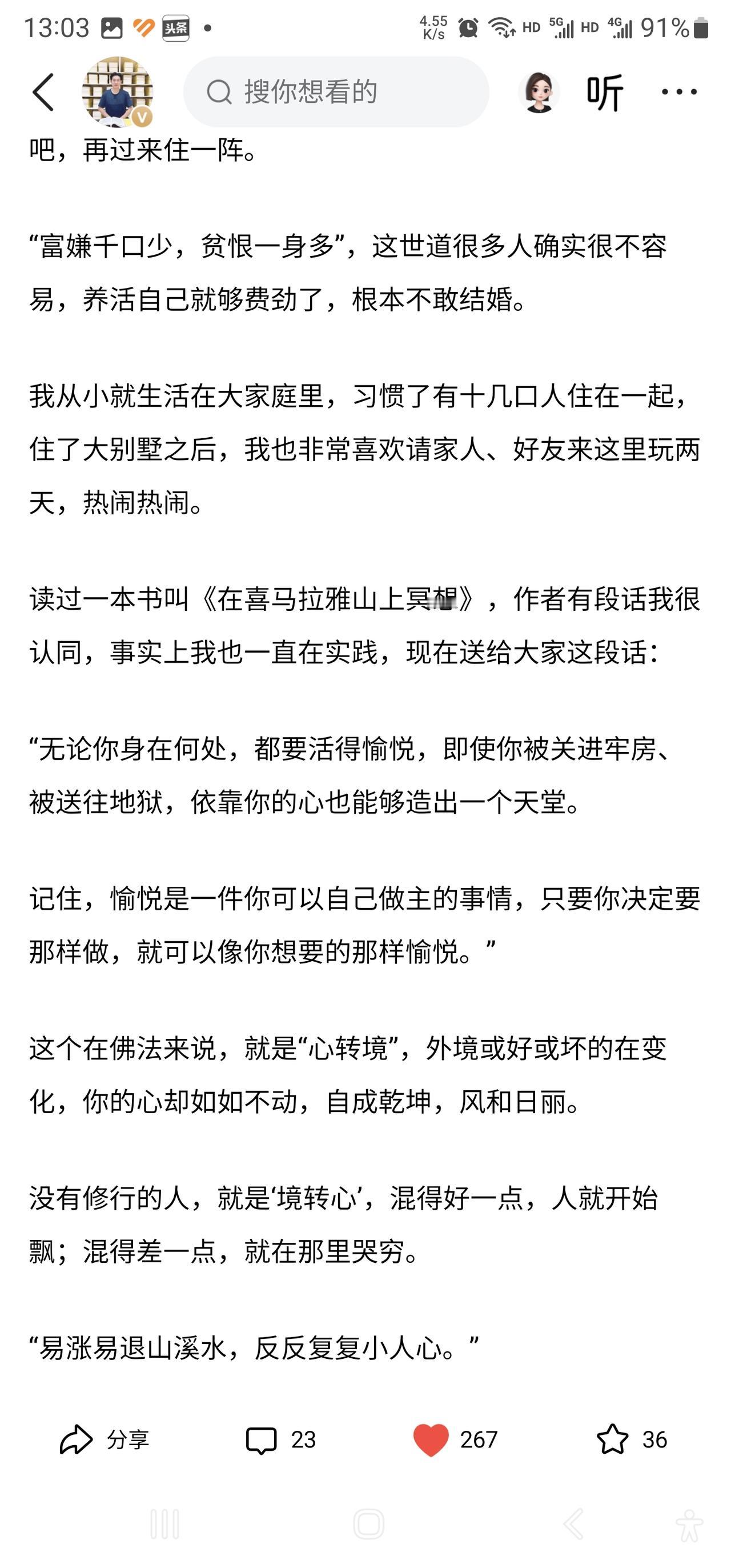 要活得愉悦,还要谨防自己陷入阿Q精神,不以物喜,不以己悲才是中国精神最好的追求。 看到很喜欢的黄安老师发的一篇文章,心里很有感触,他把读过的一本书《在喜马拉雅山上冥想》里的话推荐给我们,大概意思是无论你身处何地,哪怕是监狱牢房,愉悦都是自己可以主导的事情。 能够活得快乐当然是我们每个人都向往的,但现实生活中,考试的失利、领导的批评、客户的责问、收入的不如意等等常常让我们陷入各种焦虑和痛苦之中。 愉悦当然是我们可以主导的,阿Q不就经常精神胜利吗,在一顿歪曲事实、扭曲心理、自欺欺人后,他也是心满意足愉悦而去。 但是这种愉悦是我们想要的吗?我觉得不是,我们中学时代就学过《岳阳楼记》,我觉得范仲淹的“不以物喜,不以己悲”才是中国人精神层面的最高境界。喜马拉雅山虽高,尚没有中国士大夫的境界高远。 可是想一想,范仲淹的境界是我们普通人难以企及的高度,我们面对社会打击后怎么调节自己的情绪呢?我觉得还是要勇敢的面对现实,从眼界上把事情看小,死生之外无大事嘛,告诉自己一切都会好起来,接下来就是振作精神努力解决问题。 也许这就是物随心转的意思,也是普通人自我安慰与阿Q精神胜利不同之处。