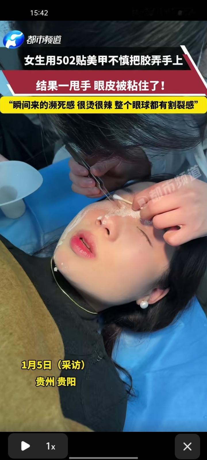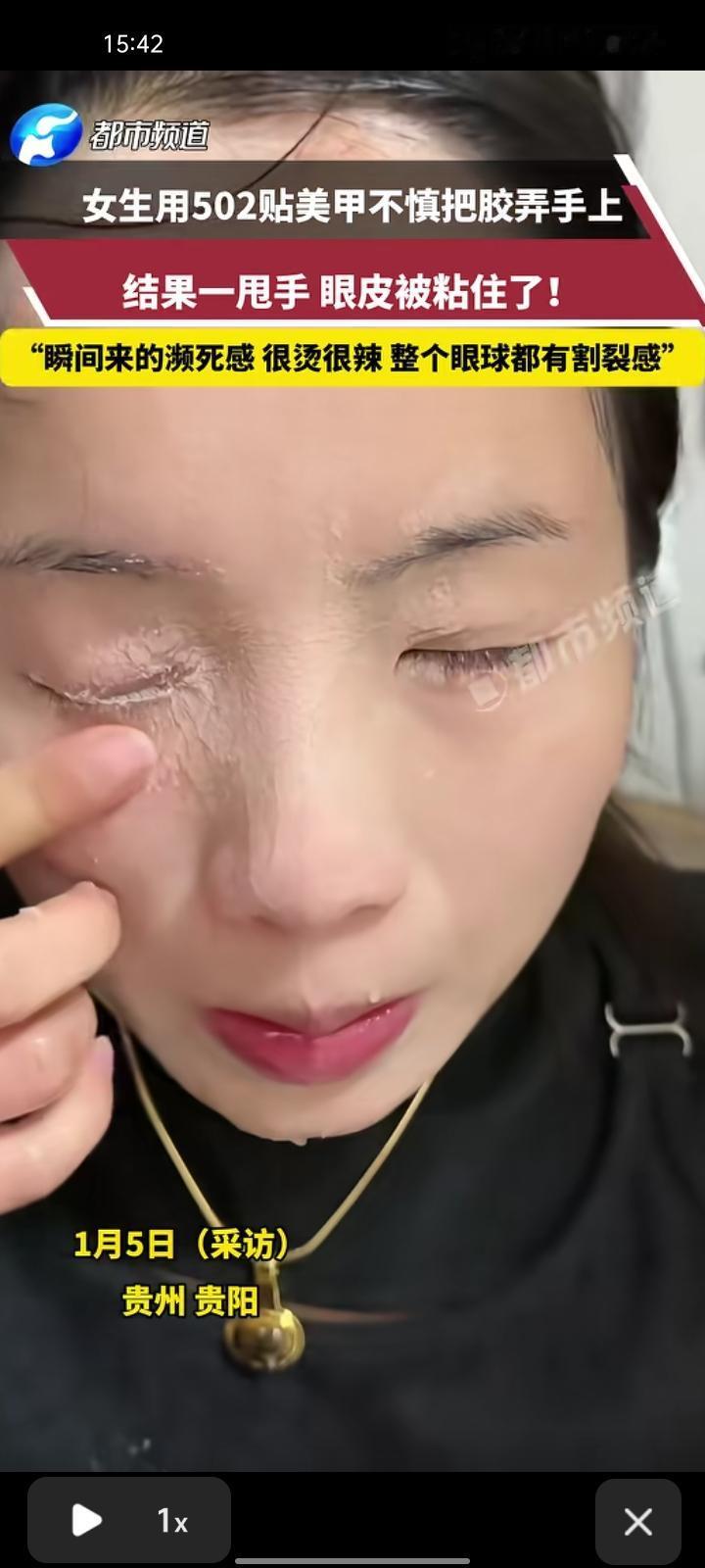 1月4日,贵州贵阳。女子用502胶水贴美甲片,不慎打翻胶水,喷溅在眼睛和鼻子上,嘴巴只碰到了一点,感觉到很烫很辣,犹如眼球被割裂。医生处理的过程非常痛苦,还是不打麻药的那种。她发视频提醒大家,使用各种胶水一定要保持好距离。