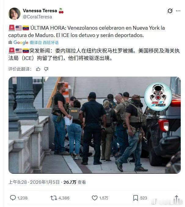 X里爆料:委内瑞拉润人走上美国大街欢庆胜利。结果被CIE执法人员候个正着。抓起来遣返。MAGA政府这是黑鱼二吃啊。