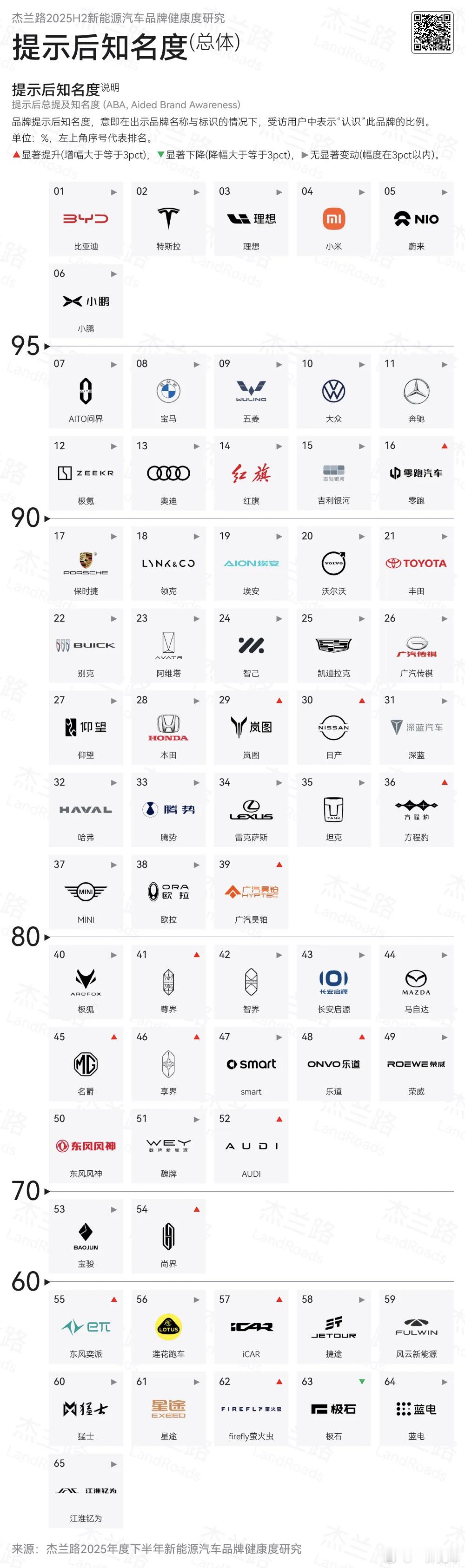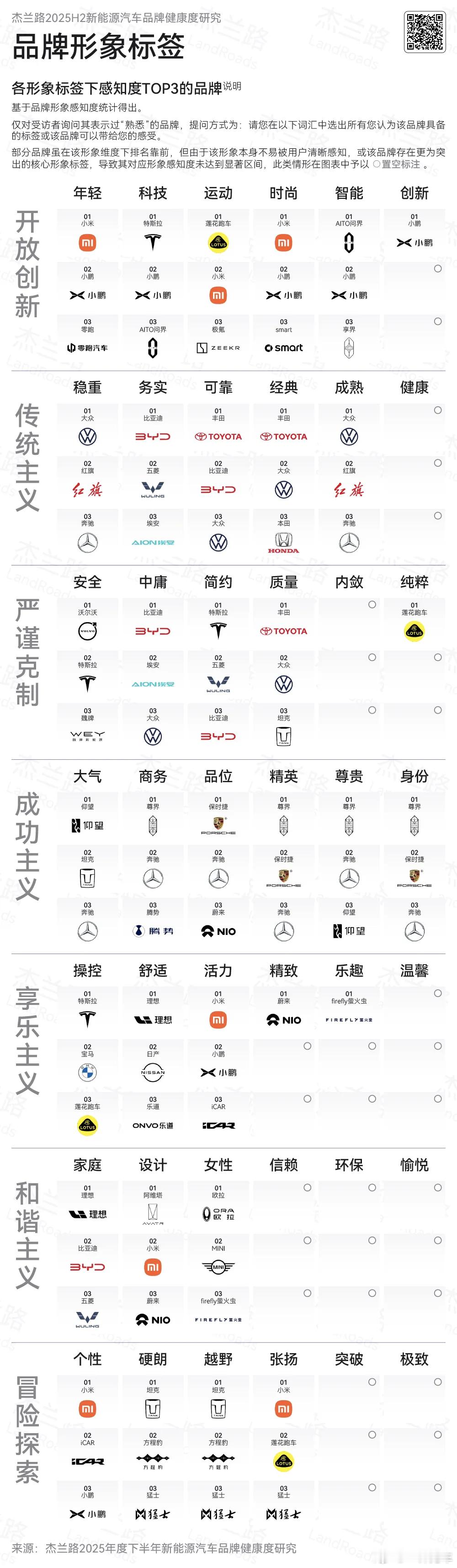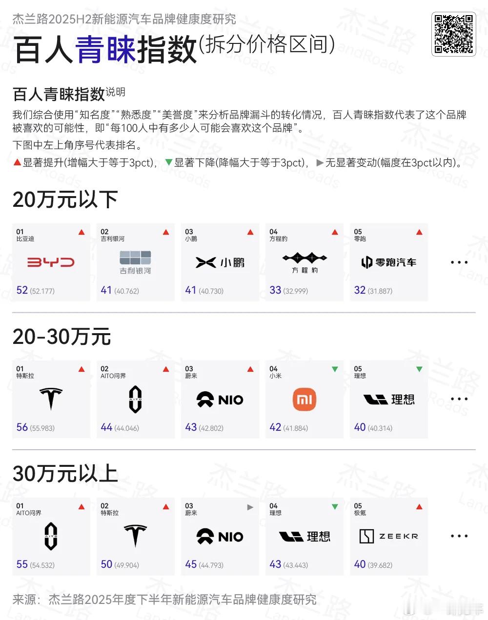 杰兰路发布了2025年下半年新能源汽车品牌研究报告,很有看头:1、百人青睐指数里,问界已经升到第二,紧跟先发优势非常强的特斯拉,相当一部分国产品牌都有明显进步;个别品牌青睐指数有大幅回落,具体名字我不敢提。2、发展信心指数方面,问界已经夺冠,品牌力和号召力无需多言;尊界尽管刚开始交付不到半年,已经让大家信心拉满。有些知名品牌似乎并未在这里榜上有名,引人深思。3、品牌档次认知上,问界已经完全不输BBA,并且超越宝马奥迪,享界紧随其后;智界的品牌档次认知并不低,已经高于特斯拉;包括尚界的档次认知也在中高档,这一点体现了鸿蒙智行统一的号召力。大家还发现了什么值得关注的点?
