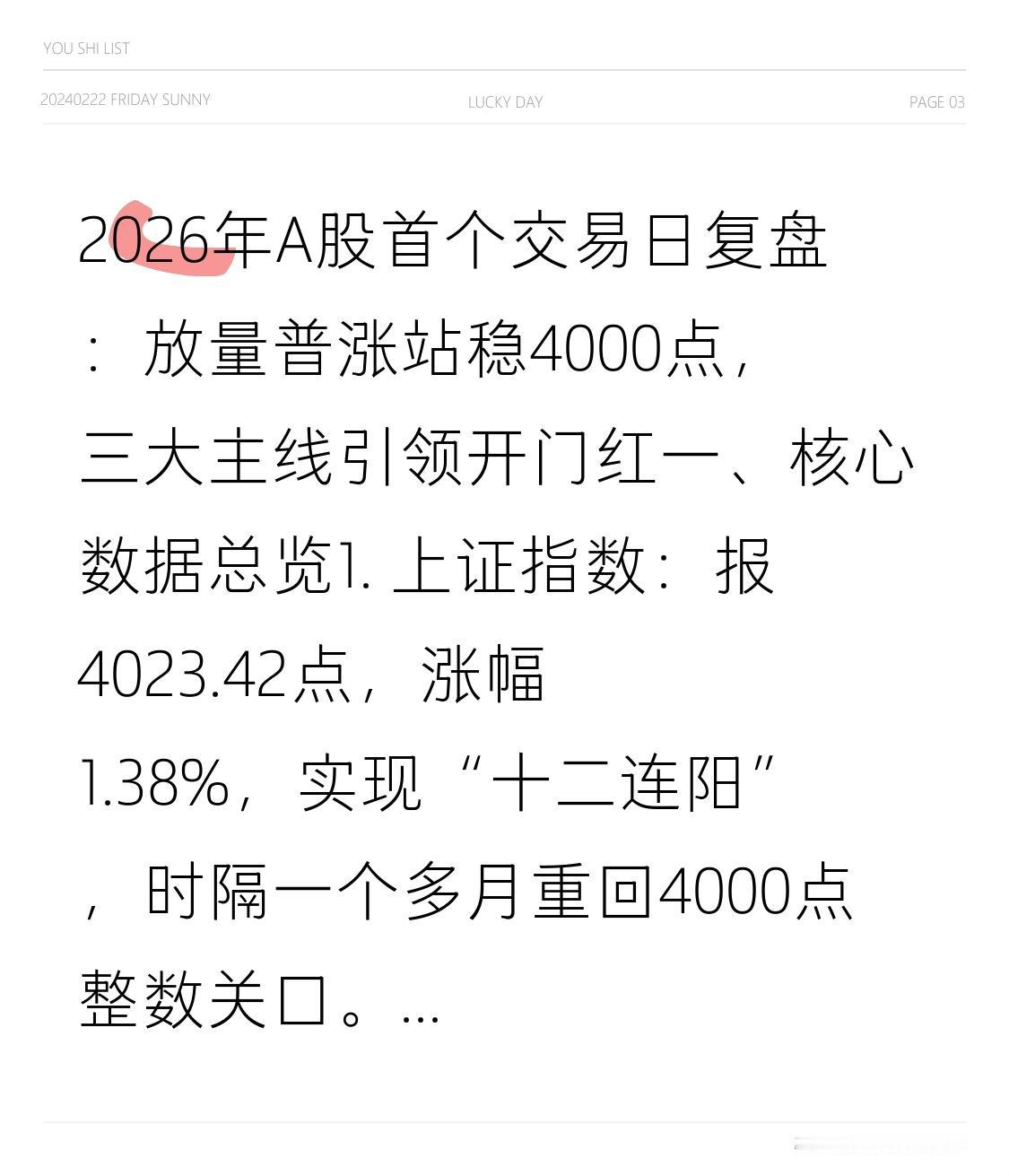2026年A股首个交易日复盘:放量普涨站稳4000点,三大主线引领开门红 一、核心数据总览 1. 上证指数:报4023.42点,涨幅1.38%,实现“十二连阳”,时隔一个多月重回4000点整数关口。 2. 深证成指:报13828.63点,涨幅2.24%,同步走高。 3. 创业板指:报3294.55点,涨幅2.85%,领跑三大主要指数。 4. 市场成交:全天成交额达2.57万亿元,较前一交易日大幅放量,增量资金入场信号明显。 5. 个股表现:超4100只个股上涨,市场赚钱效应显著。 二、市场热点解析 (一)核心领涨主线 1. 人脑工程(脑机接口)概念 板块全天强势领涨,掀起涨停潮。三博脑科、博拓生物、美好医疗、翔宇医疗等多只个股收获“20厘米”涨停。 2. 金融与科技权重股 保险板块:全天活跃度拉满,权重股全线飘红,新华保险、中国太保大涨并刷新历史新高。 半导体产业链:受行业龙头IPO等利好消息提振,亚翔集成、圣晖集成等个股涨停,板块整体走强。 (二)其他活跃题材 1. AI应用:热度持续发酵,蓝色光标斩获2连板。 2. 商业航天:概念反复活跃,雷科防务实现4连板,中国卫通走出5天3板的强势走势。 (三)相对弱势板块 旅游零售、家纺、印刷等板块表现低迷,跌幅位居市场前列。 三、资金动向与机构观点 1. 资金动态:全天成交额较前一交易日大幅放量约5000亿元,增量资金入场意愿强烈;北向资金动向暂未明确披露。 2. 机构观点:多家机构表示,2026年A股“牛市格局”具备坚实支撑,政策支持、科技创新驱动、居民资产配置转移以及市场估值修复空间,共同构成行情上行的核心逻辑。 四、复盘总结与后市前瞻 复盘总结 2026年A股首个交易日以放量长阳奠定强势开局,沪指站稳4000点且实现“十二连阳”,量价配合理想,人脑工程、金融、科技三大主线领涨,市场做多氛围浓厚。 后市前瞻 1. 关注量能持续性:成交额能否维持高位是行情延续的关键,需跟踪后续资金入场力度。 2. 跟踪主线轮动节奏:留意人脑工程、半导体等热门概念的持续性,以及热点是否向其他板块扩散。 3. 紧盯技术关口表现:沪指突破4000点后,下一步或将挑战前期高点,需警惕盘中震荡调整风险。
