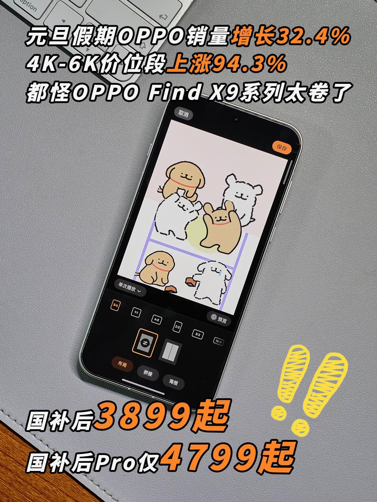 国补后3899起,OPPO Find X9系列怎么敢的? 2026这波新国补妥妥的“撒钱”模式, 不用抢券,下单就能直减,等等党彻底赢麻了~ 像苹果这边,iPhone 17在补贴加持下,到手5499起, 在“牙膏挤爆”的情况下,这价格说一句真香升级不过分。 很多原本想再等等的人,看到这个价位基本都坐不住了。 但要说卷,国产旗舰明显更狠。 尤其是绿厂的Find X9系列:标准版国补后 3899 起,Pro版4799起, 关键有些平台叠活动直接干到3699 起、Pro4599起 再加上还有至高可享24期免xi,价值299的礼盒(莎莎礼盒/线条小狗礼盒/新品上市礼盒)任选一个, OPPO这一波“又减又送”的操作真的太顶了。 这也难怪最近销量这么猛, 据说2026年元旦手机市场大盘销量同比上涨了16.2%。 而OPPO以 32.4%的涨幅稳居主流厂商第1名! 尤其在4K-6K这个档位,Find X9系列直接拉动了94.3%的增长!! 趁着首批625亿补贴还没抢完,有打算换手机的O粉们,现在上车简直不要太爽! OPPOFindX9 OPPOFindX9Pro 国补 元旦换新机 手机推荐 性价比手机 iPhone17 我的数码生活