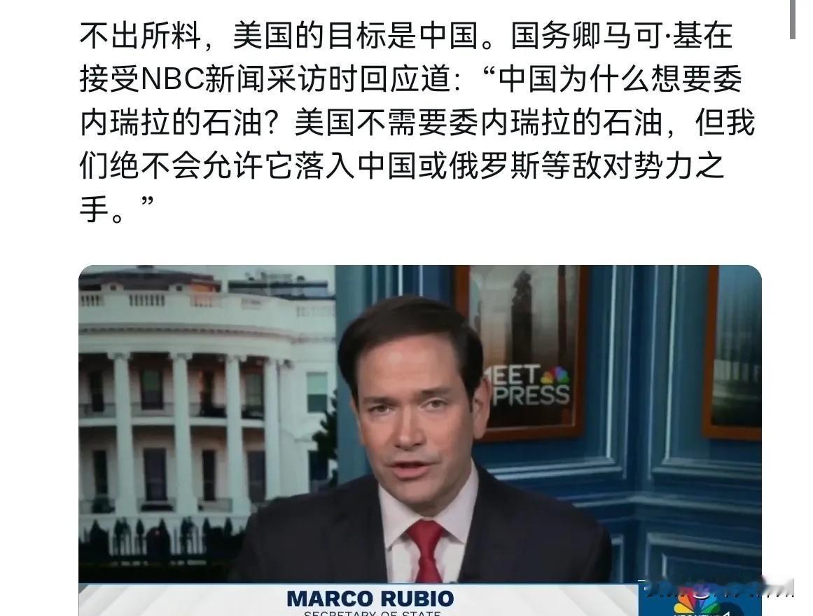鲁比奥把话说的是真直白!1月5日,美国国务卿鲁比奥在接受美国全国广播公司新闻频道采访时表示:中国为何会“觊觎”委内瑞拉的石油?美国并非需要委内瑞拉的石油,但我们绝不允许委内瑞拉石油资源落入中国、俄罗斯这类“敌对势力”的掌控之中。 评几句: 一语道破霸权本质!鲁比奥的“石油禁令”,藏不住美国的垄断野心 美国国务卿鲁比奥1月5日的表态,堪称美式双标的典型范本:一边声称“美国并非需要委内瑞拉石油”,一边却强硬喊话“绝不允许委石油资源落入中国、俄罗斯手中”。这番说辞,看似冠冕堂皇,实则将美国的霸权逻辑暴露无遗。 要知道,委内瑞拉坐拥全球17%的已探明石油储量,其产出的重质原油,恰好适配美国墨西哥湾沿岸炼油厂的加工标准——这是公开的能源行业常识。美军此前对委内瑞拉发动军事突袭,随后鲁比奥跟进推出“石油隔离”措施,封锁油轮运输通道,本质上就是为了扫清障碍,让美企趁机接管当地石油产业。所谓“不需要”,不过是掩盖掠夺意图的借口。 更值得玩味的是,鲁比奥口中的“敌对势力”,恰恰是与委内瑞拉开展平等合作的伙伴。中委合作始终遵循互利共赢原则,中国企业带去资金与技术,助力委方提升石油产能,用人民币结算帮其规避美元霸权风险,这与美国动辄制裁、军事干预的掠夺式操作,形成鲜明对比。 说到底,鲁比奥的表态,本质上是“只许美国独占,不许他国共赢”的霸权思维作祟。这种违背国际公平正义的单边主义行径,注定会遭到越来越多国家的反对。