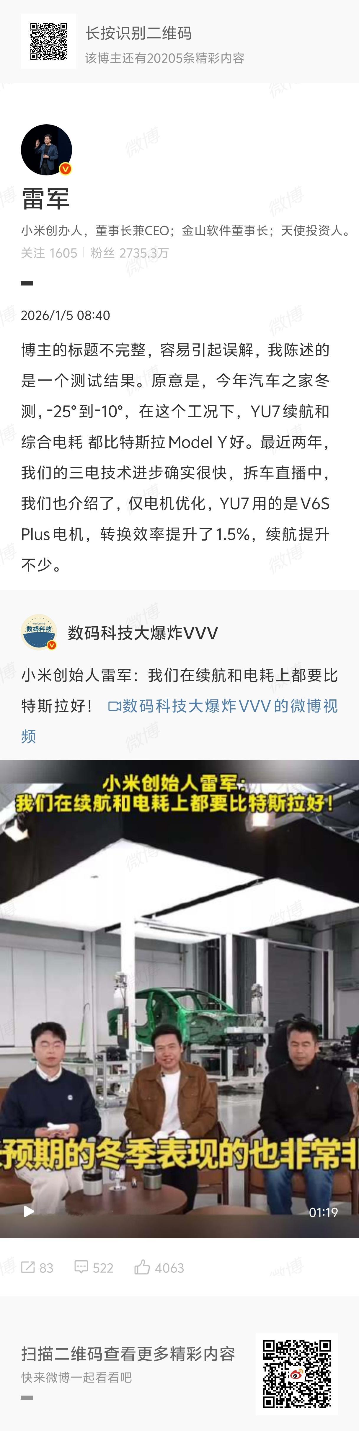 雷军回应续航电耗超特斯拉其实真挺强的,比特斯拉大、重,动力也更强,不管啥工况下能