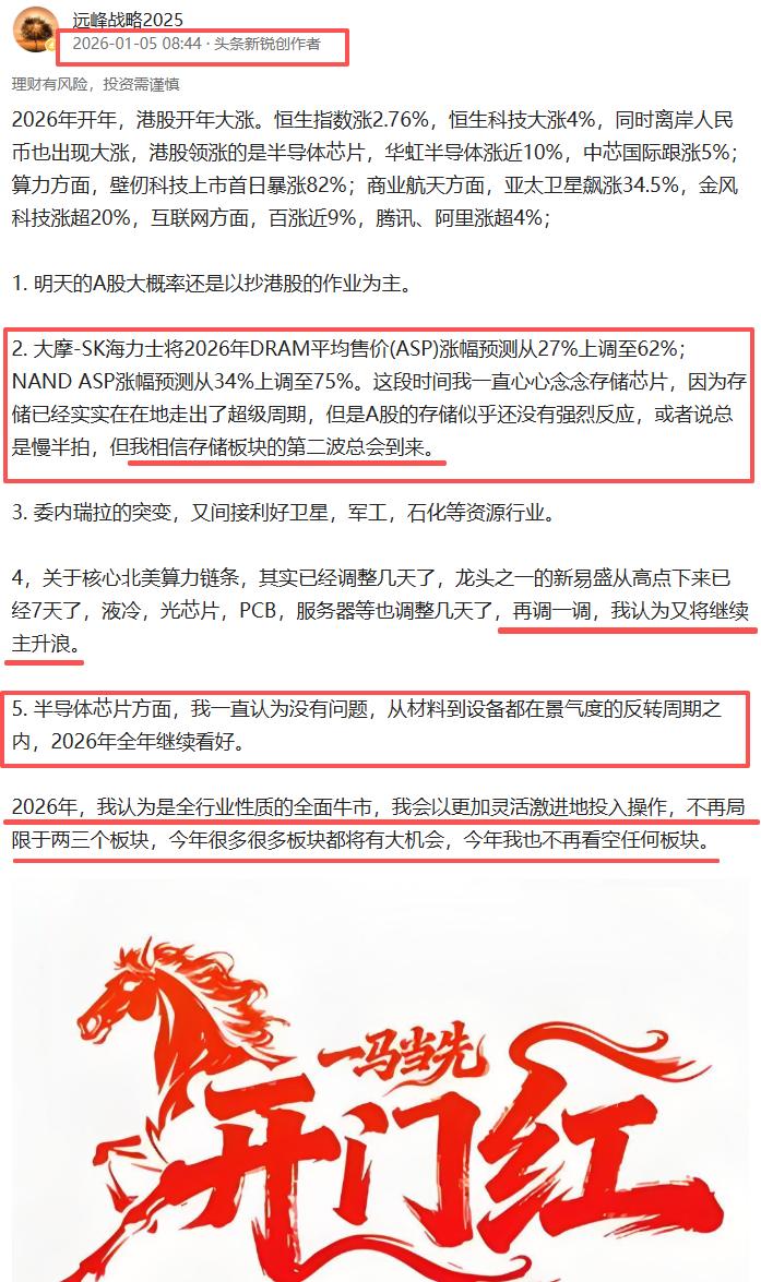 今天五大指数全线上涨,正如开盘前所判断的是个开门红的行情,放量5000亿,全天成交2.5万亿,带量突破,科技股和周期股双轮驱动,属于普涨格局,不管怎么样开门红就是好兆头。 今天比较欣慰的是AI应用全线爆发,龙头蓝色光标继续20厘米封板,心心念念的存储芯片也全线爆发,普冉股份,恒烁股份,云汉芯城,西侧测试等20厘米封板。通用半导体芯片方面全天也亮眼表现。 另外算力方面今天比较显眼的是胜宏科技终于挺直了腰杆,在经历了十多天的震荡后迎来大阳,接下来一月算力产业链大概率由胜宏科技所代表的高端PCB产业链继续开启主升浪之旅。 今天靓丽的仔还是脑机接口,这个板块本质上其实是AI应用的一个分支,虽然亮眼,但我不确定他能走多远,这个概念依旧是跟随马斯克的脑机接口进展消息的刺激。从特斯拉,到机器人,到OPEN AI,到Space X的商用火箭,再到脑机接口,其实嗅觉灵敏的人应该得出一个结论,马斯克对于A股的热点影响巨大,一定要盯牢马斯克在做什么?接下来要干什么?过去的干的事现在进展到哪里? 换句话说,马斯克在做什么,你就去做什么。别小看这句话,回过头去看看过去的A股,你会发现这么极简的一句话其实是开启财富大门的金钥匙,不管那本书上都找不到。 不管如何,今天第一天开门红,值得庆祝一个。