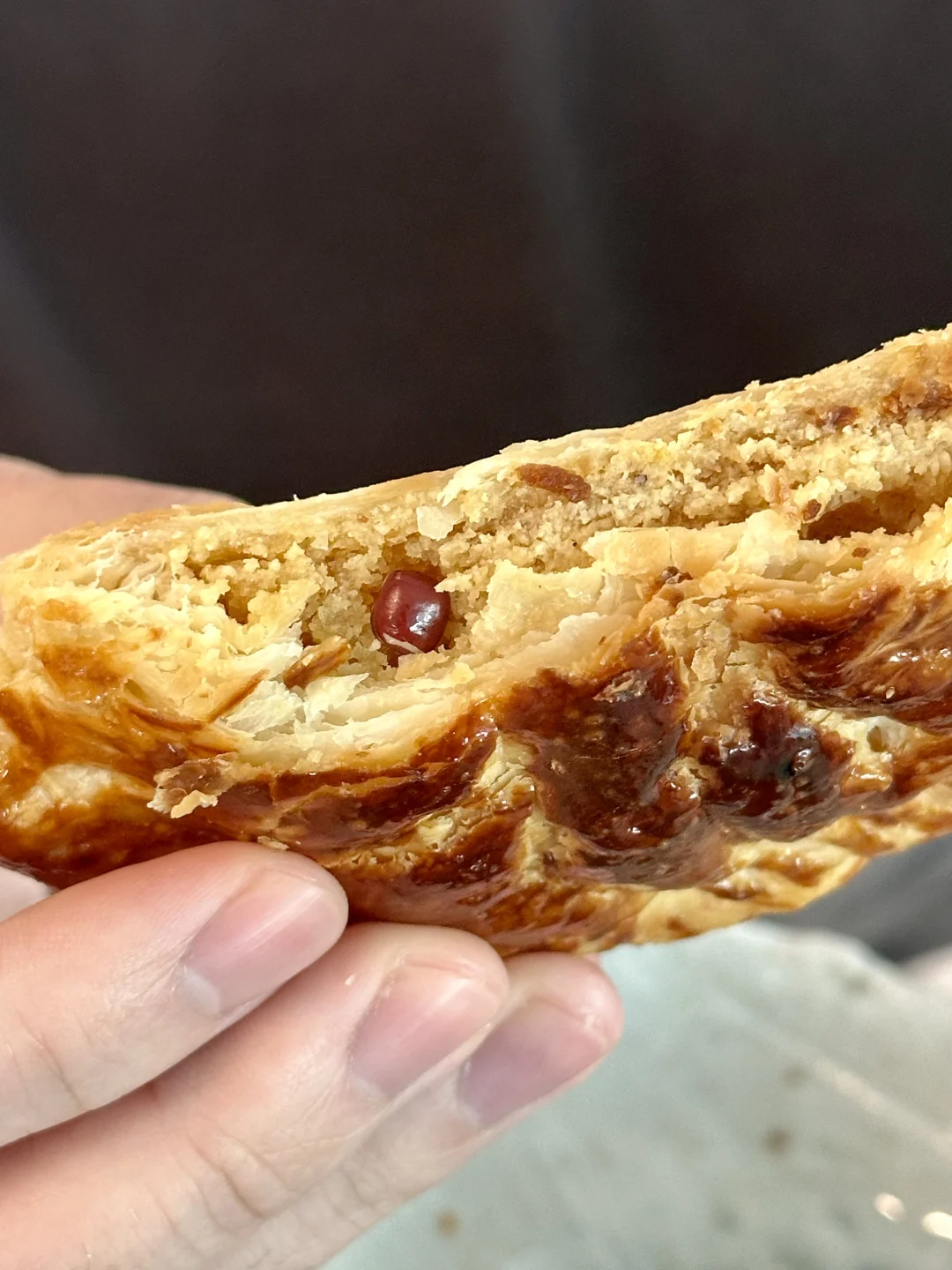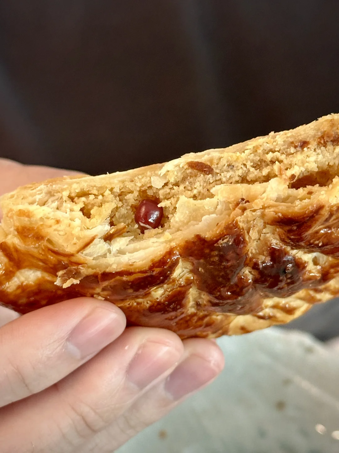 在稍小的酥皮饼上放入杏仁奶油馅儿,记得放上红豆或小瓷人增加趣味,然后盖上稍大的酥皮,四周捏紧;