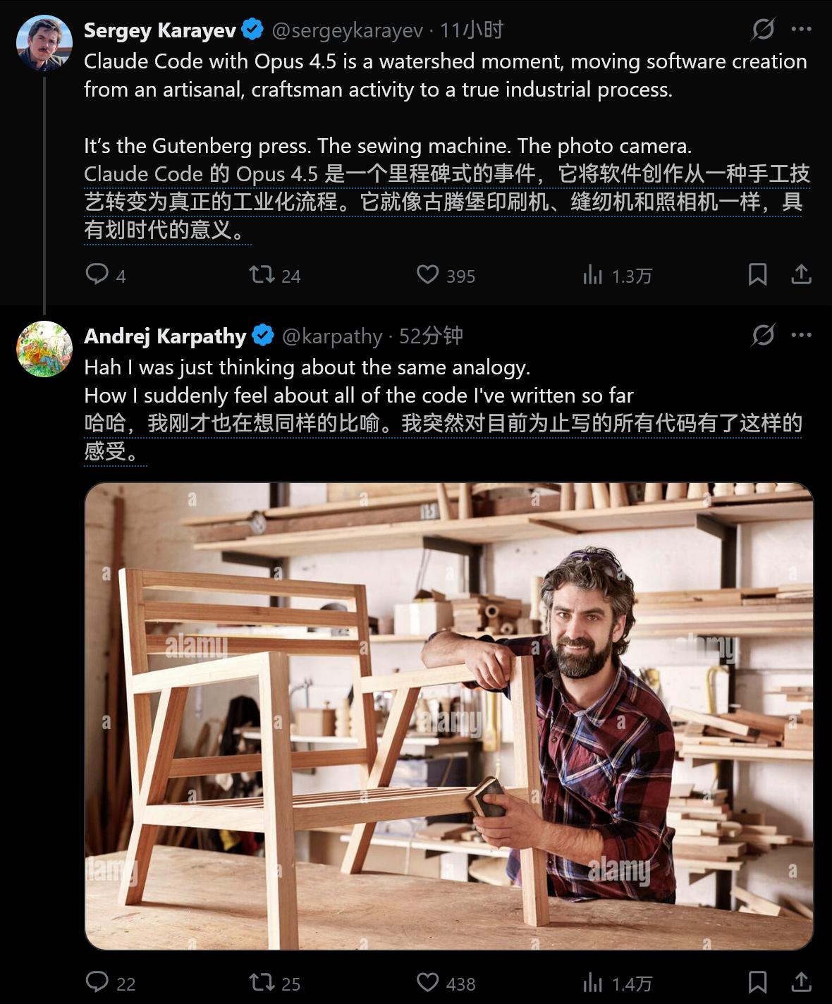 "Claude Code 搭配 Opus 4.5 是一个分水岭式的时刻,它将软件创作从一种手工匠艺活动转变为真正的工业化流程。它就是古腾堡印刷机。缝纫机。照相机。"科技先锋官