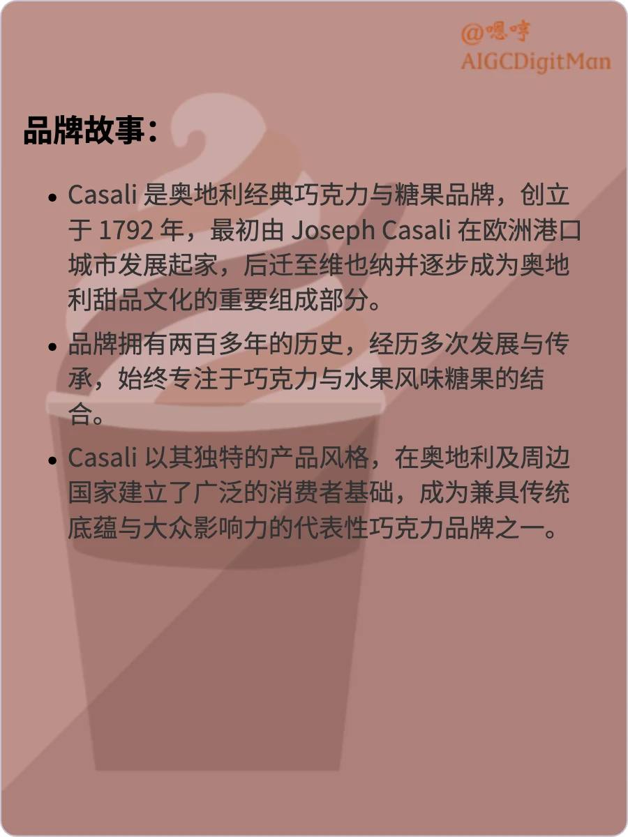 Casali 是奥地利经典巧克力与糖果品牌,创立于 1792 年,最初由 Joseph Casali 在欧洲港口城市发展起家,后迁至维也纳并逐步成为奥地利甜品文化的重要组成部分。