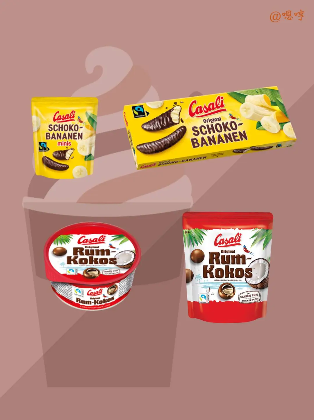 巧克力水果系列代表品牌: Casali 以巧克力包裹水果风味糖果闻名,尤其以巧克力香蕉系列成为品牌标志性产品。