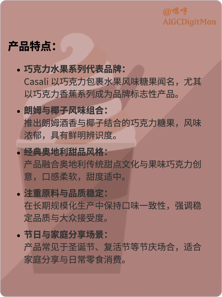 Casali 以其独特的产品风格,在奥地利及周边国家建立了广泛的消费者基础,成为兼具传统底蕴与大众影响力的代表性巧克力品牌之一。
