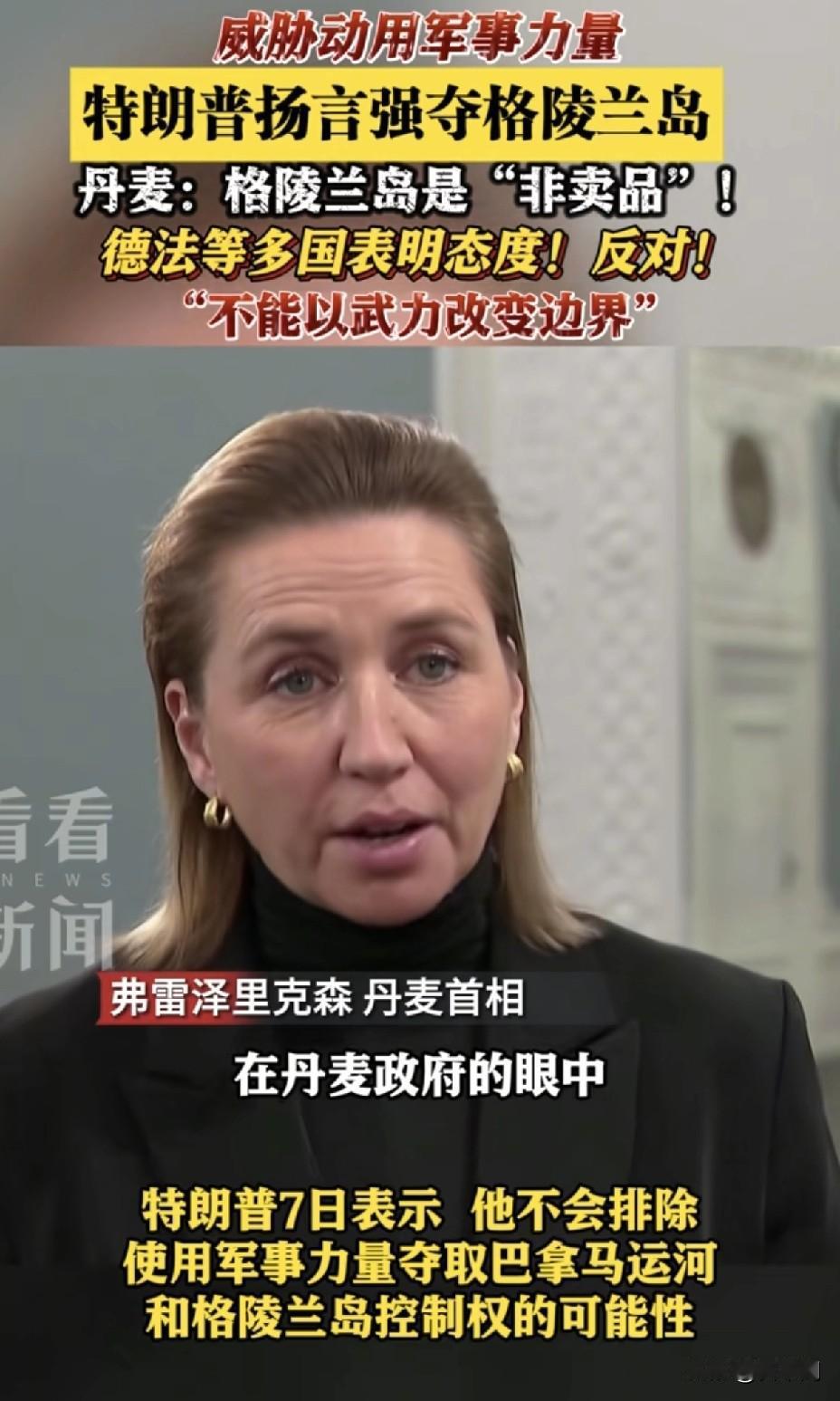 特朗普豪言“必须得到”格陵兰岛, 33岁总理强硬回怼:不属于美国! 北极资源宝地格陵兰岛, 正成为大国博弈新焦点。 美国总统特朗普多次宣称, 美国“必须得到”格陵兰岛。 他声称此举是出于“国家安全”考虑。 甚至表示不排除使用“军事手段”的可能性。 看看格陵兰岛的明确态度: 1️⃣ “美国得不到”: 总理尼尔森直言,格陵兰不属于任何其他国家。 2️⃣ “不是商品”: 强调格陵兰永远不会成为可供交易的“财产”。 3️⃣ “未来自己定”: 格陵兰的未来将由当地居民自己决定。 面对美方步步紧逼: ✅ 美国已任命“格陵兰岛特使”, 旨在推动该岛成为美国一部分。 ✅ 美副总统曾率团登岛, 指责丹麦“投资不足”。 ✅ 美政府高官妻子甚至在社交媒体发布格陵兰岛覆盖美国国旗的图片。 格陵兰与丹麦的反应强硬一致: 总理尼尔森斥责相关图片“不尊重”。 强调国际关系应基于相互尊重和国际法。 丹麦首相、外交大臣等多方均强烈反对,捍卫主权。 这场围绕北极的争端仍在持续。 它涉及主权尊严、国际法准则与资源战略的复杂较量。 点赞看小国如何捍卫自身权益? 关注看这场“购岛”风波将如何收场? 评论看美国的真实意图是什么?