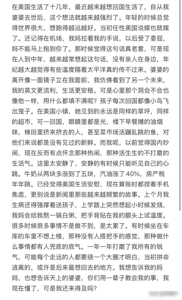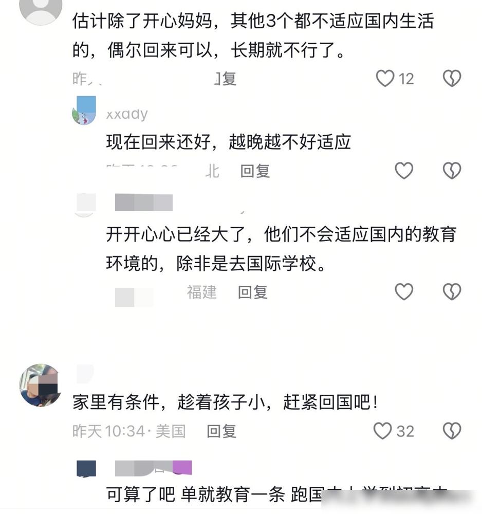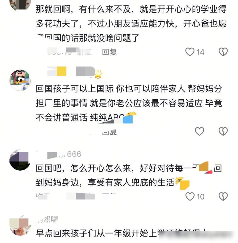 开心妈妈回国长期定居,直言婆婆去世,让自己无法接受,众多朋友纷纷表示支持,究竟又怎么回事? 其实是远在国外的博主开心妈妈,最近因为婆婆不幸因病离世,在全家人深陷悲痛的同时,她决定带着丈夫和两个儿子彻底搬回中国定居。 看到这个消息,我第一反应是理解。她本是江苏人,当初留学认识了开心爸爸才在国外扎根。原本一家四口的生活很美满,但至亲的突然离开,往往会打破所有的生活平衡。 我总觉得人在异国他乡,最怕的就是这种“来不及”。平时生活再幸福,一旦面对生离死别,那种孤立无援的漂泊感就会成倍放大,这大概也是她回国念头越来越强烈的导火索。 说实话,做出回国长期定居的决定并不容易。毕竟他们在国外打拼多年,两个孩子也已经习惯了那边的环境。 但我倒觉得,这种选择反而是对全家人的一种治愈。人在极度脆弱的时候,只有回到根源的地方,回到自己熟悉的环境和亲人身边,那颗心才能真的落下来。 婆婆的去世可能让她重新思考了人生的优先级。比起事业和国外的环境,那种“子欲养而亲不待”的遗憾,她可能不想在其他亲人身上再体验一次了。 这也折射出很多海外游子共同的心结:在外面闯荡久了,总有一个瞬间会让你觉得,家乡才是唯一的退路。 不论如何,带着孩子换个环境重新开始需要很大的勇气。希望这种回归能抚平他们的伤痛,在国内开启一段更安稳的日子。