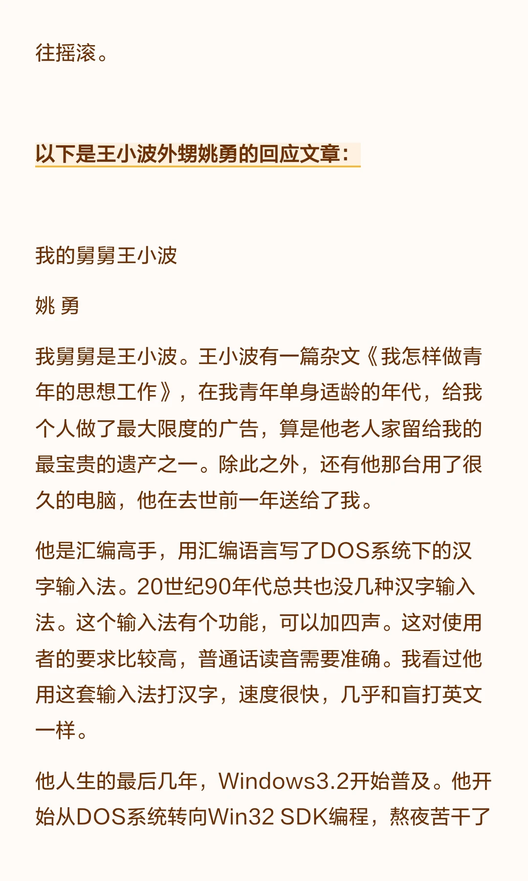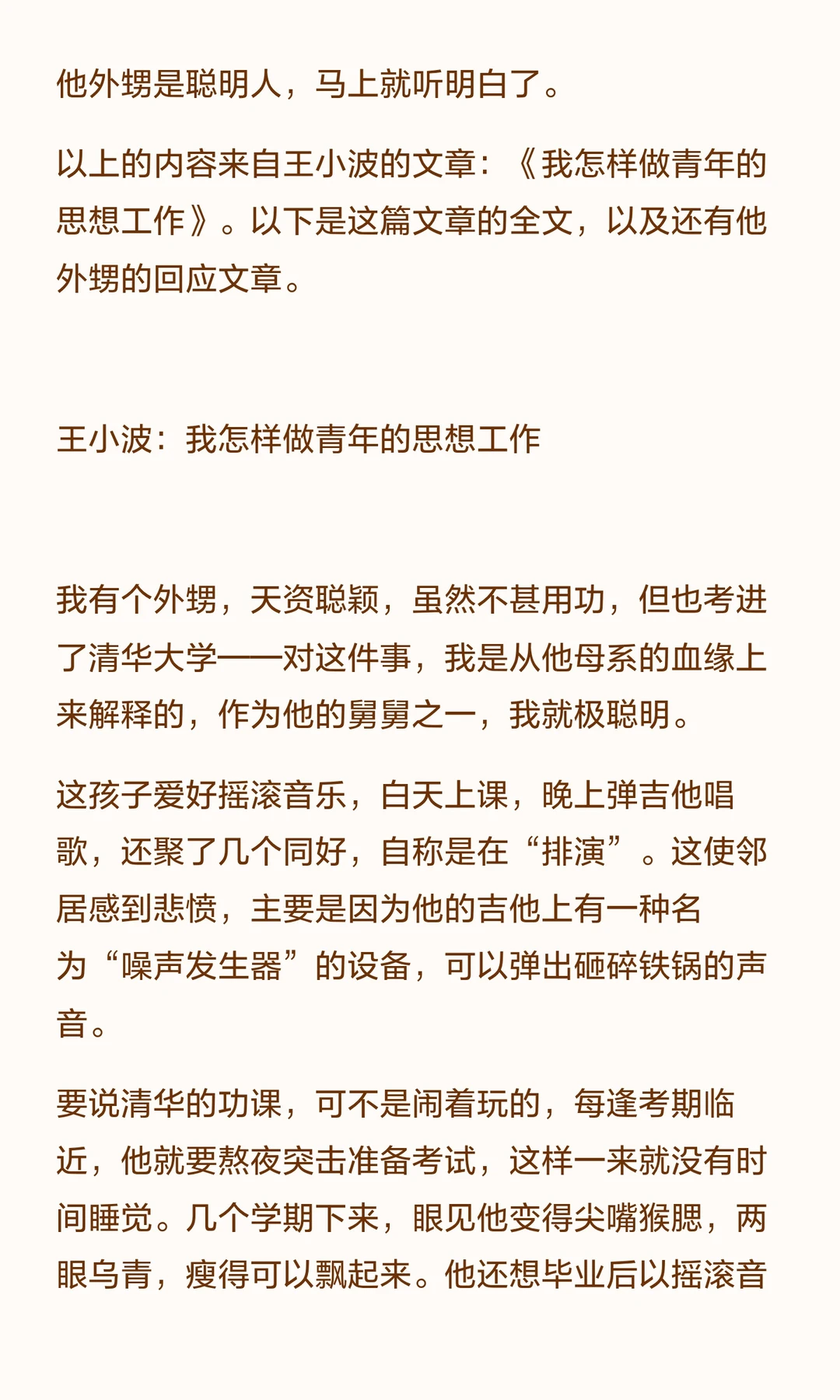 王小波的外甥热爱摇滚音乐,但被舅舅劝阻,建议他先专注于学业,毕业后再追求音乐梦想。