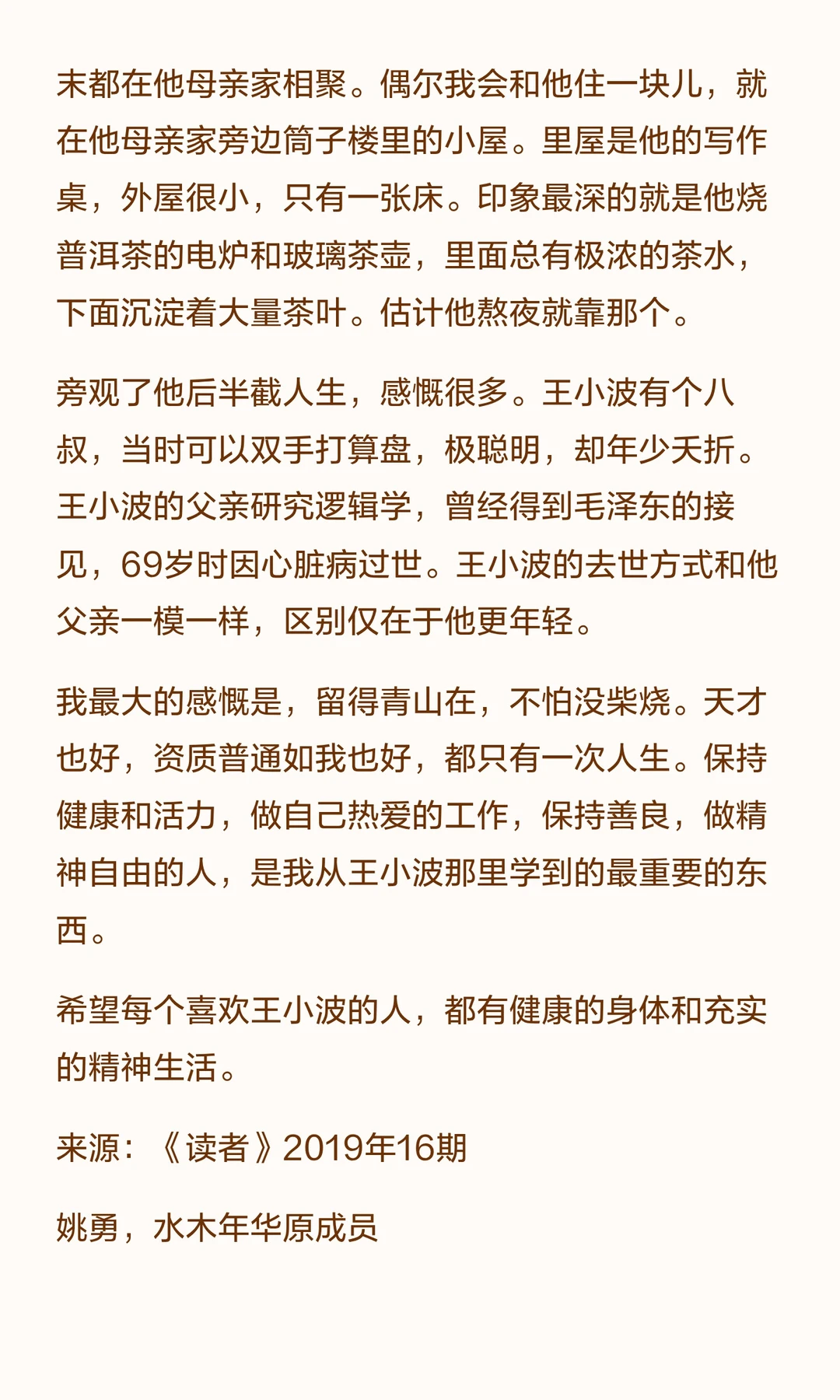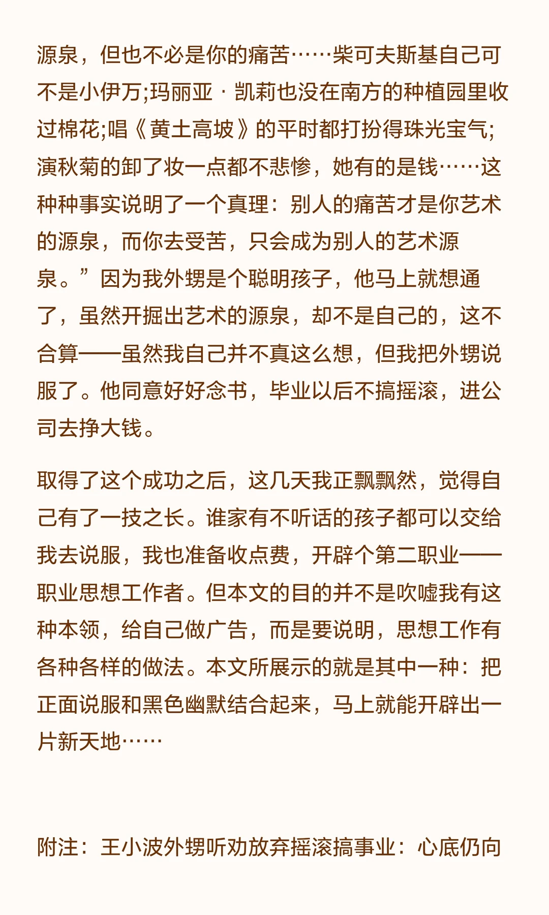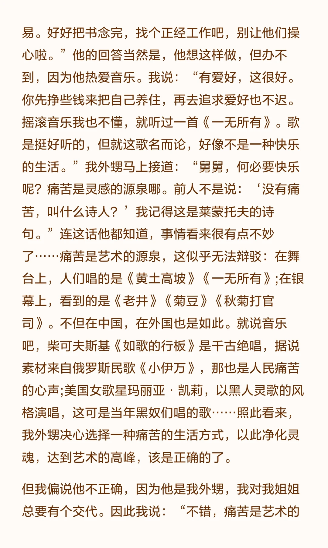 王小波的外甥想以摇滚乐为生,不听劝,说,“舅舅,何必要快乐呢?痛苦是灵感的源泉哪。前人不是说:‘没有痛苦,叫什么诗人?’我记得这是莱蒙托夫的诗句。”