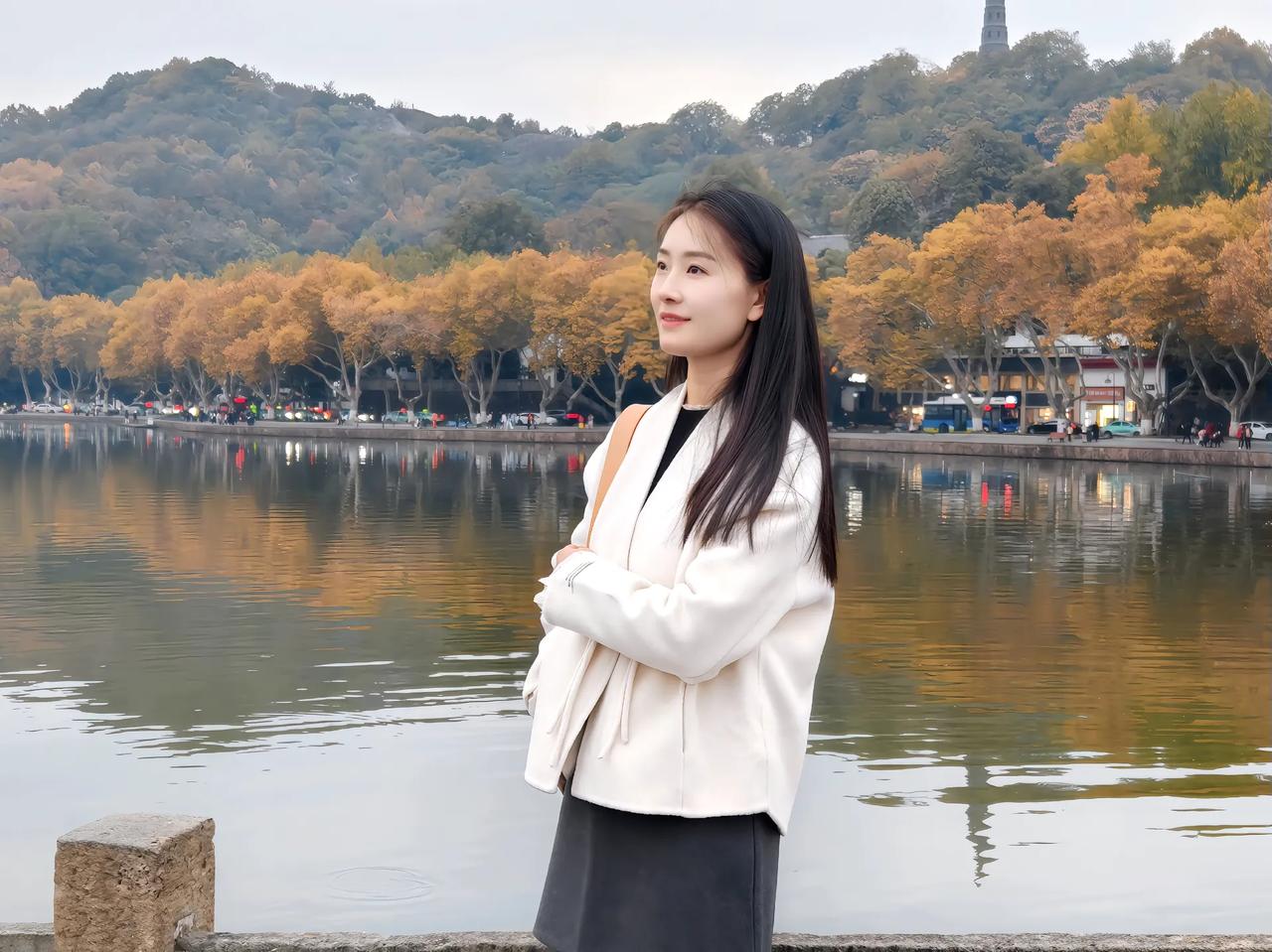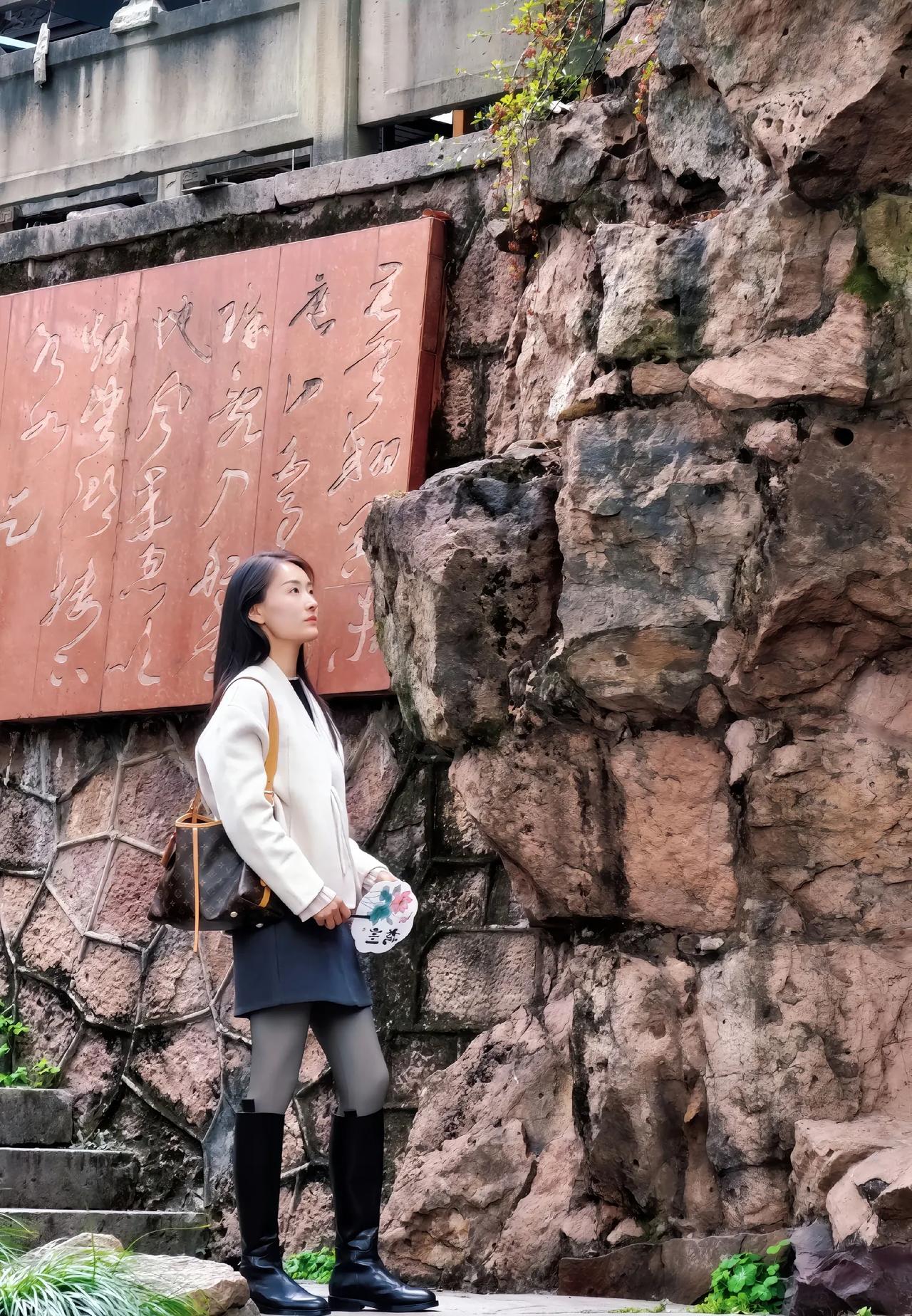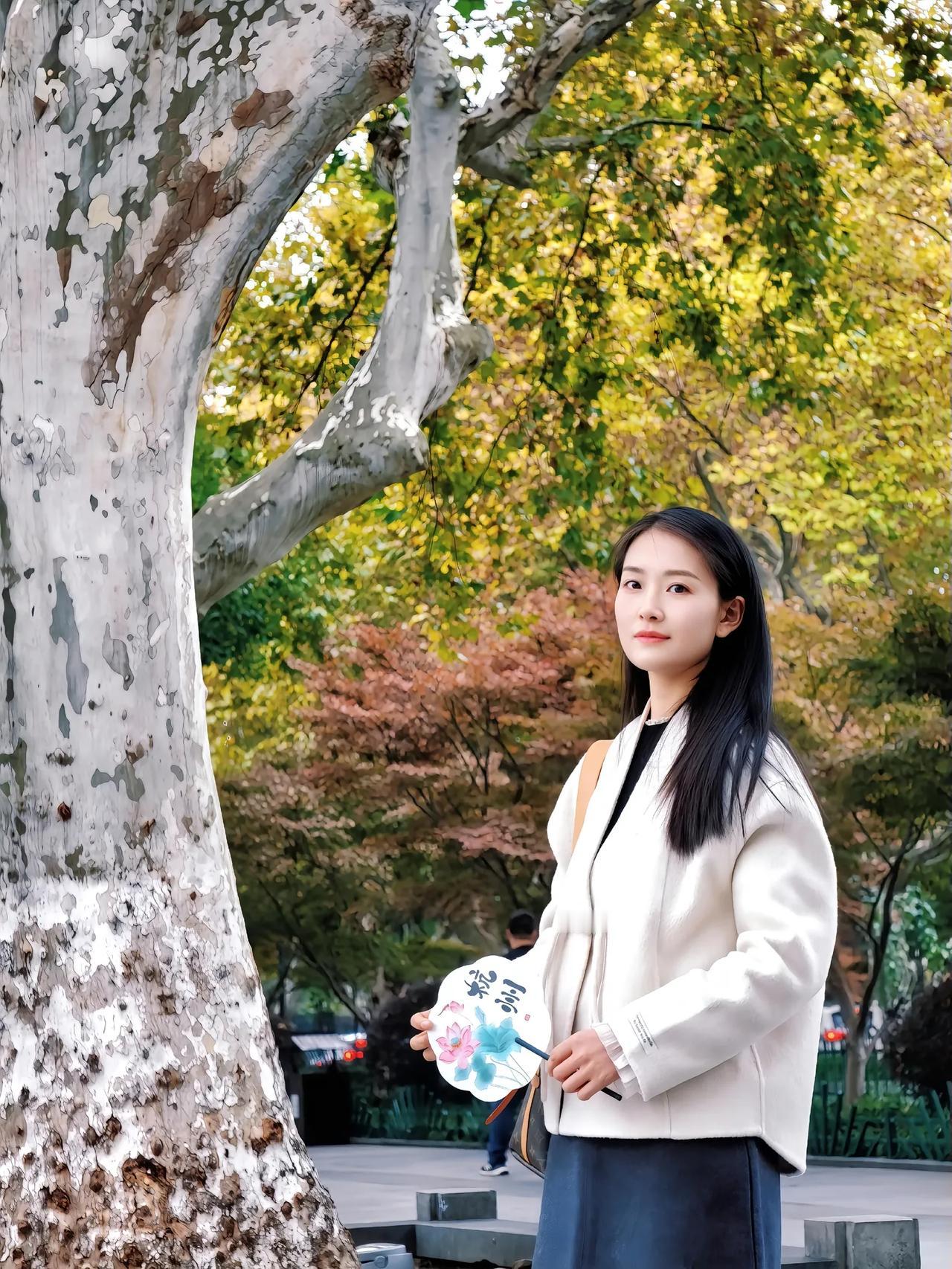 秋日漫步,树影婆娑,手持团扇,悠然自得。