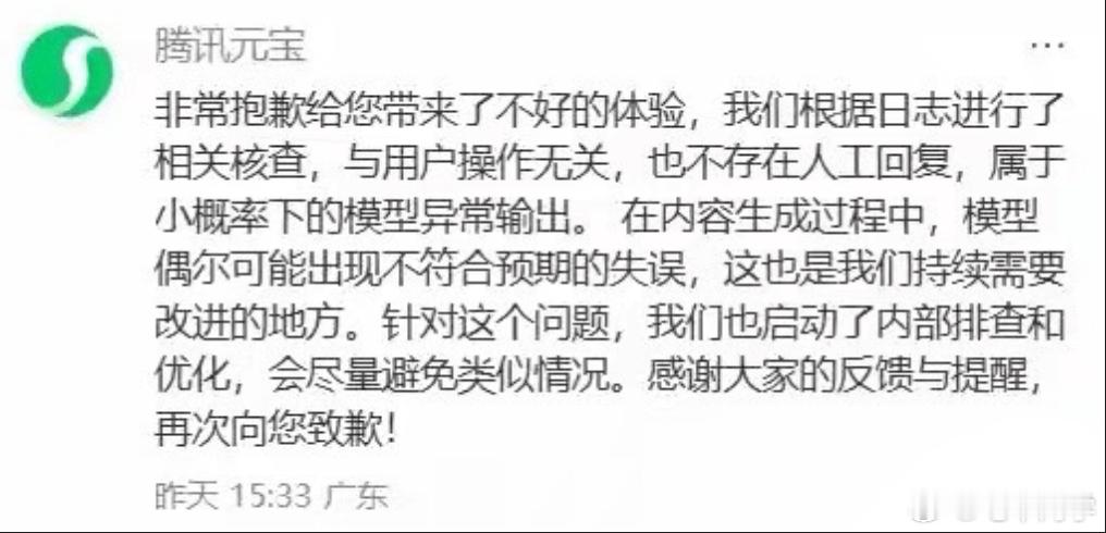 腾讯元宝AI喷脏话,官方致歉说是小概率模型异常。元宝这么下去,马上就要比