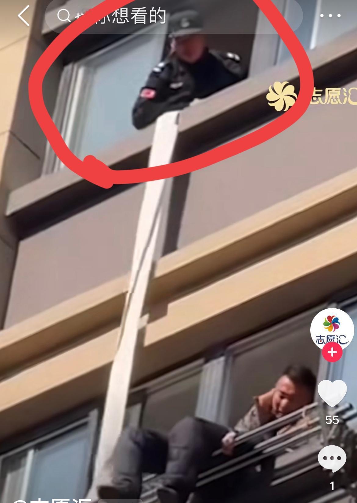 军功章里也有他的一半!那个默默无闻、又稳稳拉着消防带的人,也是值得表扬的! 老人高处坠落,福大命大,落在7楼的晾衣杆上,但是7楼的房门无法打开。物管人员张伟腰系消防带,从8楼踩着外墙的阶沿,满满翻到7楼窗户,进入7楼后,再稳稳地把老人拉进屋。大家都很安全。 那个白色消防带开始也是被稳稳拉着,慢慢地向下放,直到救人的张伟进入7楼,他才探头出来观看。 张伟救人,胆大心细,稳稳当当,是时代楷模! 而拉着消防带的,他是幕后英雄!