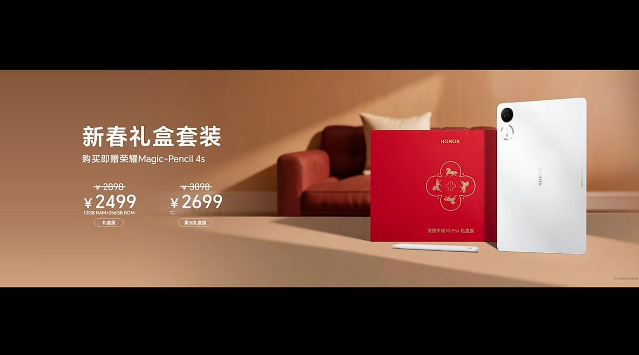 荣耀平板10 Pro售价: 12+256G 2499元, 12+256G柔光版 2699元, 荣耀Magic-Pencil 4s手写笔售价399元; 新春礼盒限量直接送手写笔,当然是选新春礼盒划算啊!