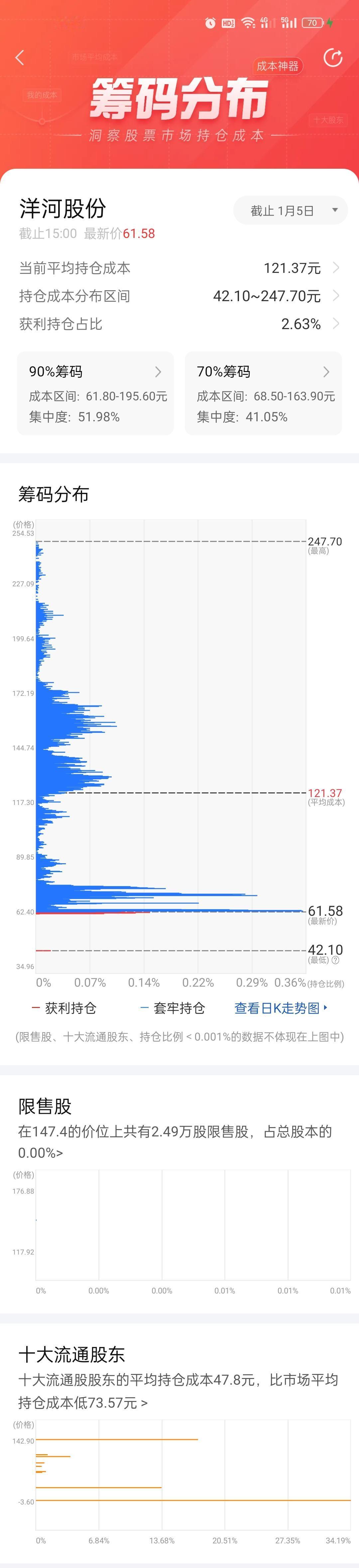 看到洋河股份的筹码图,真的倒吸一口凉气。股价从山顶滚下来,61块的价格,可平均成本还在121块上方——这意味着,每100个持股人里,超过97个是亏钱的。 仔细看,大量筹码像“山”一样堆在68到195元的高位,这叫“套牢盘”。每次股价想抬头,这些套牢的人就想解套卖出,形成重重抛压。而赚到钱的只有零头的2.63%,市场几乎没人敢笑。 更扎心的是,十大股东平均成本才47块,比市场均价低了一大截。说白了,机构早就低位布局或跑得快,留在山顶站岗的,多半是散户。 眼下这走势,跌势还没停,筹码也没换手。如果没大利好或大资金进来,想翻身真的难。炒股有时就是这样,成本的分布比K线更真实,也更残酷。对于普通人来说,别急着伸手接飞刀,等那座“套牢山”被时间慢慢消化,可能才是更稳妥的选择。