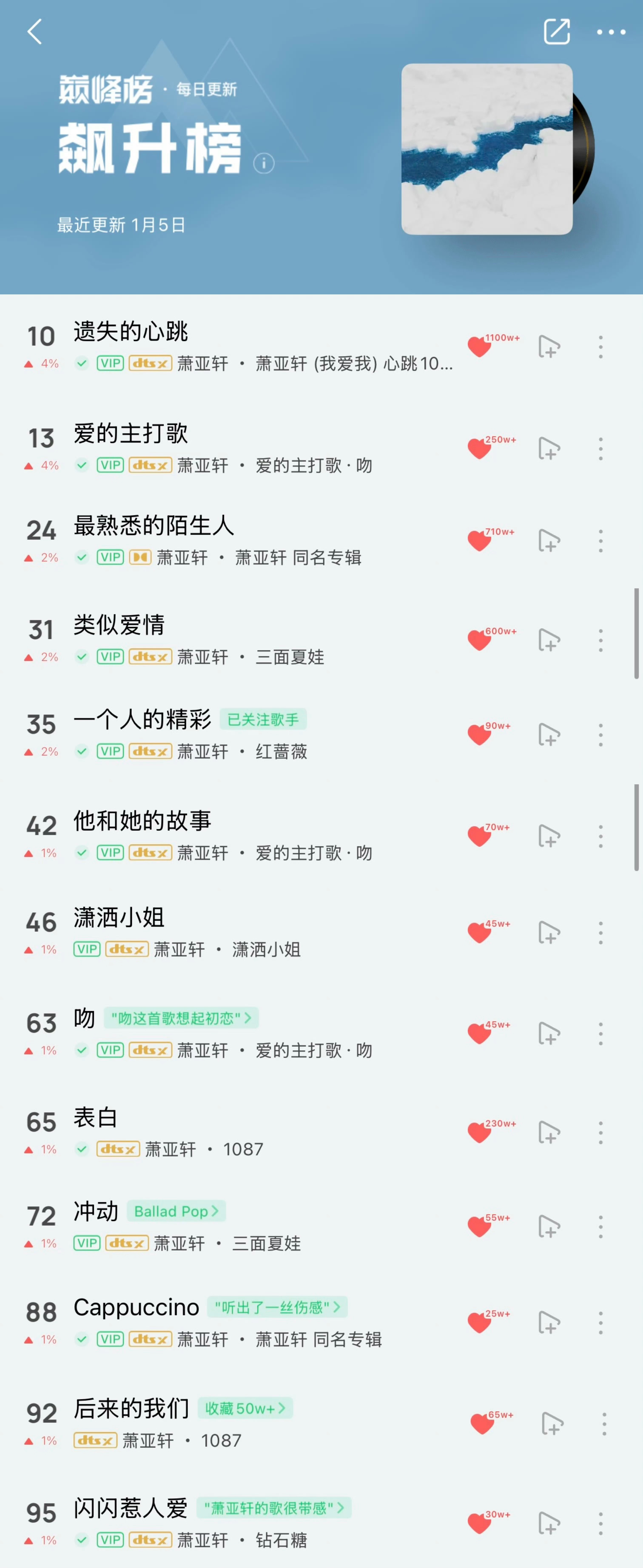萧亚轩跨年后,又看到了天后的基本操作,一天13首歌上飙升榜,毕竟作品厚度在那里,等演唱会开起来,这些经典作品还会持续回潮。萧亚轩一天13首歌上榜