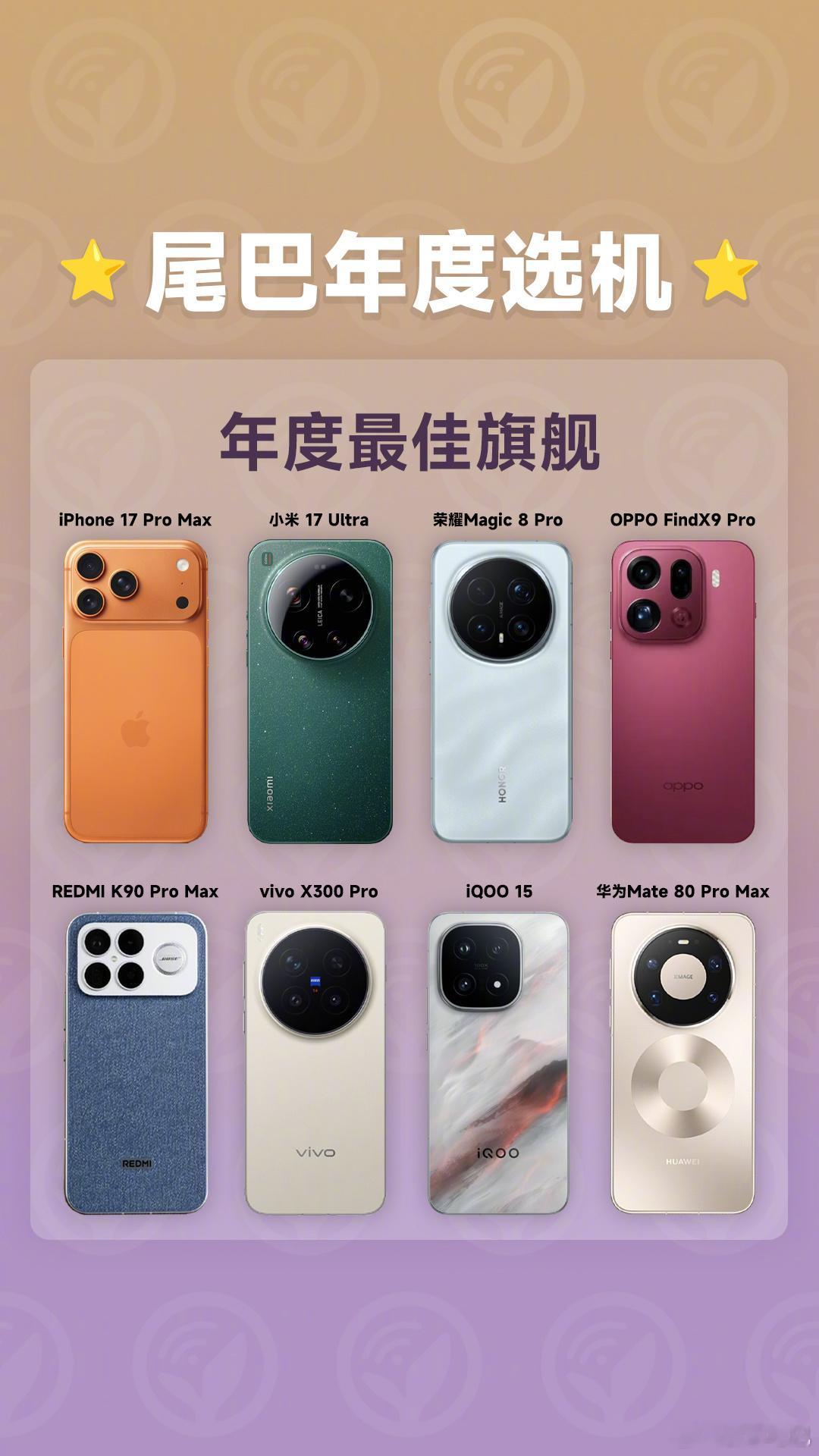 尾巴年度选机 昨天的尾巴年度选机直播中,我们根据价位、配置、实际体验,以及直播间大家的意见综合评判,选出以下各机型 📱年度拍照手机:vivo X300 Pro,凭借蔡司三摄与2亿APO长焦,vivo X300 Pro在人像、视频、夜景、高倍率等场景下表现极为出色 📷 另外作为演唱会神器,这台在我司可以说是同事借用频率最高的机子了年度性价比手机:REDMI K90Pro Max,25年的红米有点太狠了,4000价位给到了小米旗舰同款超级像素屏、一骑绝尘的音质、第五代骁龙8至尊芯片,妥妥的六边形战士年度设计手机/年度垃圾:iPhone Air,这两个评选并不冲突,好设计≠好产品,iPhone Air在给到轻薄手感的同时,牺牲了及格的续航和多元的影像。eSIM的无卡槽设计对于目前国内用户转卡换机时依然缺乏一定的便利性。而这一切,居然建立在7999元的起售价上年度最佳游戏机:荣耀WIN,1万毫安电池+散热风扇+第五代骁龙8至尊,再配合荣耀护眼屏幕的看家本领。这就是个能打游戏的充电宝 🎮年度最佳旗舰:今年的各个品牌旗舰差距微乎其微,给到谁都似乎有些站不住脚。只能说这八部旗舰手机盲选一部都能给到出色的用户体验,他们在续航、影像、性能等核心方面都是目前手机第一梯队🏆年度折叠屏:荣耀Magic V5,折叠屏里最为轻且薄的,8.8mm厚度217克重量甚至轻过一些直板机,在这个基础下塞进了6100mAh电池,也是目前折叠屏最大容量。其屏幕的抗弯折性及折痕也控制得非常出色。年度最佳手机:iPhone17,如果说最佳旗舰手机太难定夺,那去掉「旗舰」二字之后答案便明了得多,iPhone17标准版凭借120Hz刷新率与A19芯片牙膏挤爆,5999起售价更是卡进国补位直接让标准版销量远超预期。年度小屏手机:vivo X300,在如今的小屏手机市场,如何在小空间里做出更精密的硬件堆叠并保证性能的稳定输出依然是厂商的核心难题,vivo X300除了尺寸上的缩减,其他配置依然看齐旗舰定位。日常体验丝毫不逊色,对于小屏爱好者是个相当不错的选择。