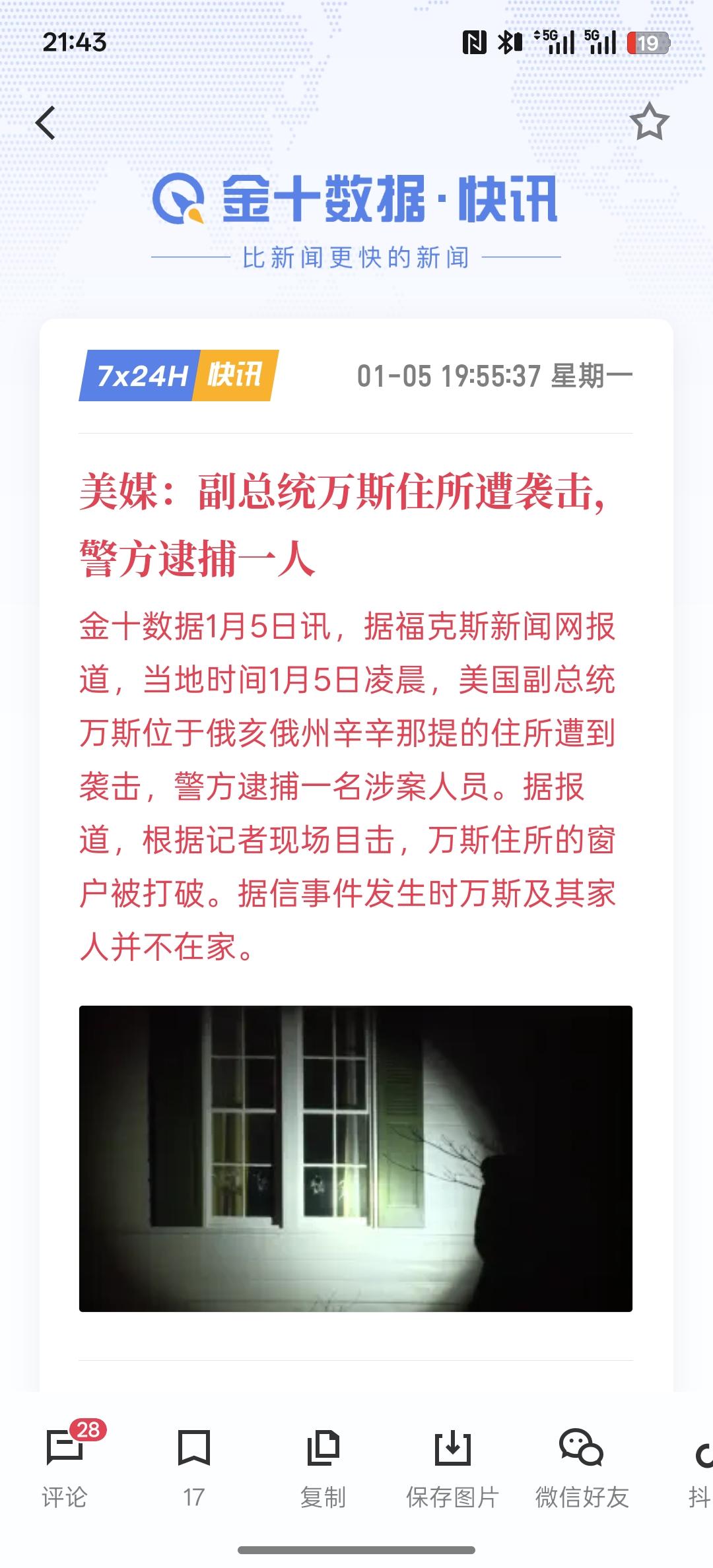 开始被反噬了,美媒:副总统万斯住所遭袭击,警方逮捕一人,那估计按照这个事态发展,未来美国可能会遭受恐怖主义袭击!美国这样做完全不得人心!为了自身的利益,损害别人的利益,尤其是窥探委内瑞拉的石油储备!美国对委内瑞拉动武,其目的还是石油。为了解决美国高昂的债务问题,美元绑定的就是能源,包括资源!如果美国的美元没有石油作为背书,美元未来将会沦为废纸!毕竟美国的债务已经超出了很大的上限范畴!很多国家在抛售美债,没能购买美国新发的美债!也就是美元信用体系正在走向崩塌甚至失控的边缘!