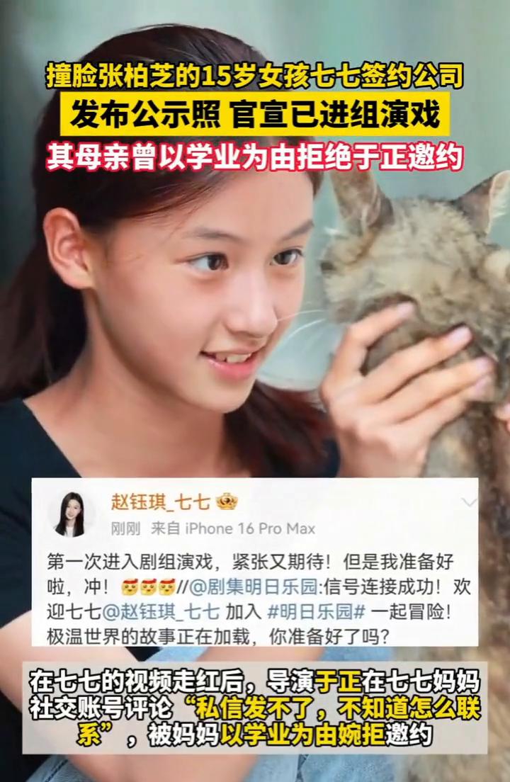 撞脸张柏芝的15岁女孩七七签约公司,发布公示照官宣已进组演戏,其母亲曾以学业为由拒绝于正邀约。 1月5日,报道时间:2025年7月,河南南阳15岁女孩七七因一段素颜街拍视频意外走红,被网友夸神似年轻时的张柏芝。 大家好,我是七七赵钰琪。Q赵钰琪的公式照颜值好能打!在七七的视频走红后,导演于正在七七妈妈社交账号评论"私信发不了,不知道怎么联系",被妈妈以学业为由婉拒邀约。 2026年1月5日,其个人社交平台公开签约传媒公司,并官宣已经进组拍戏。