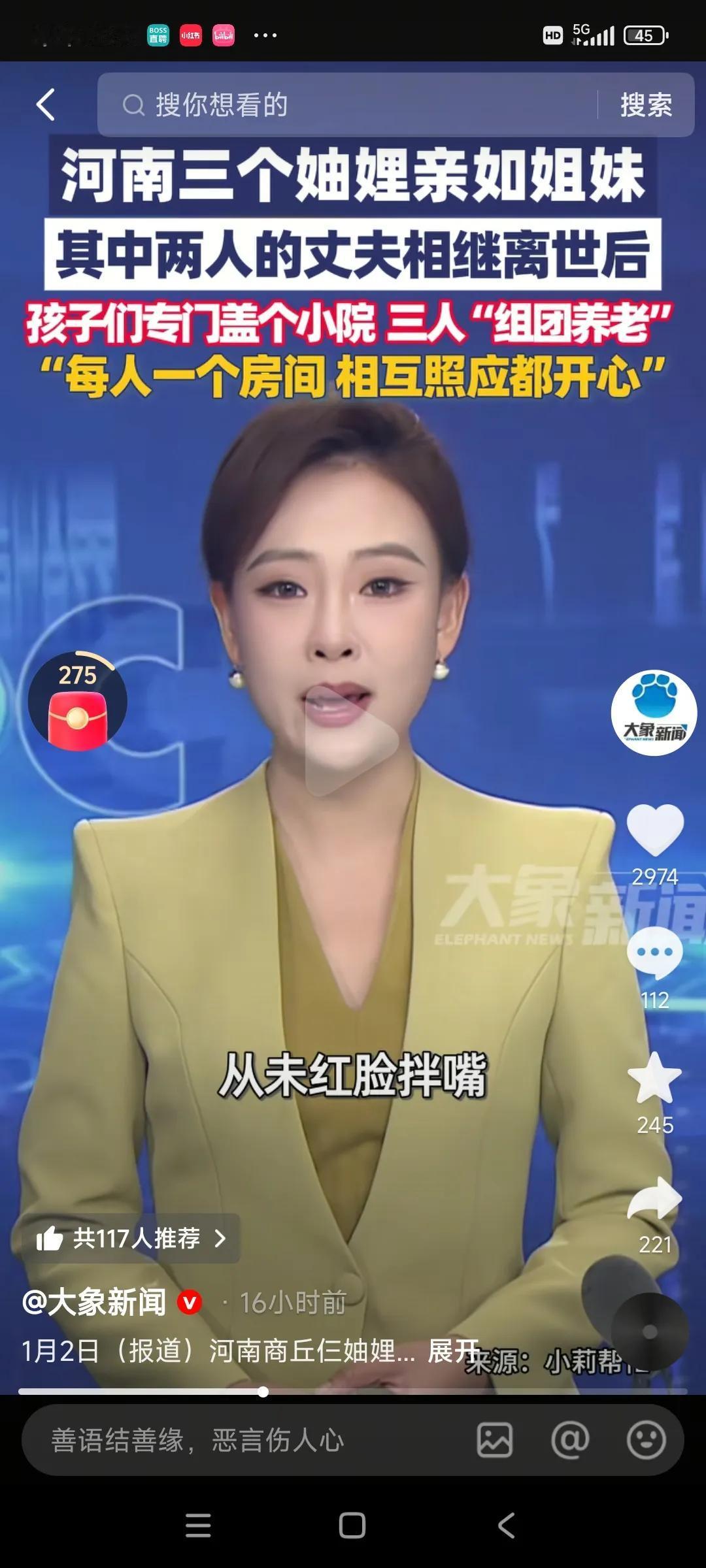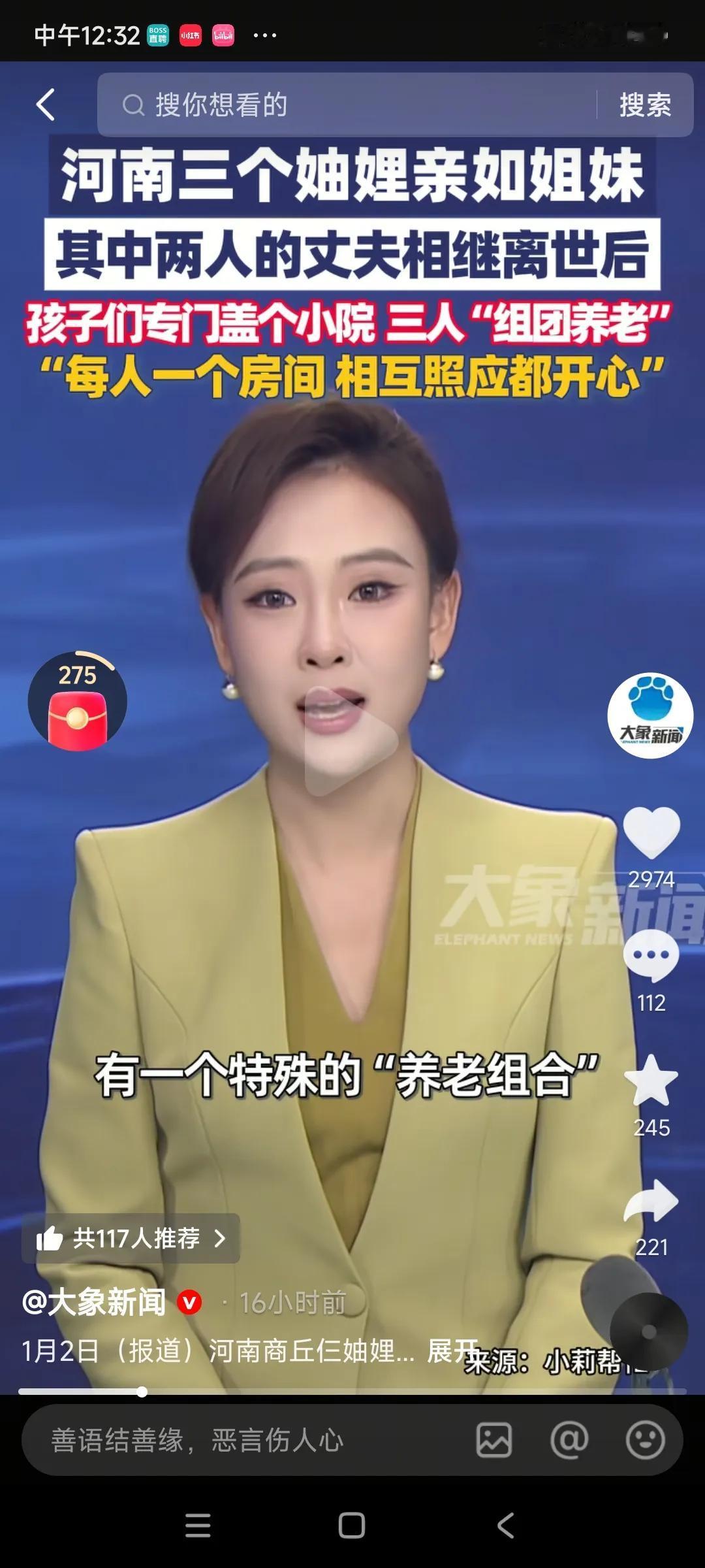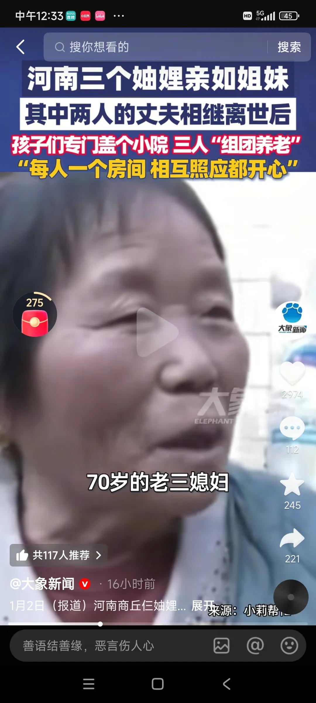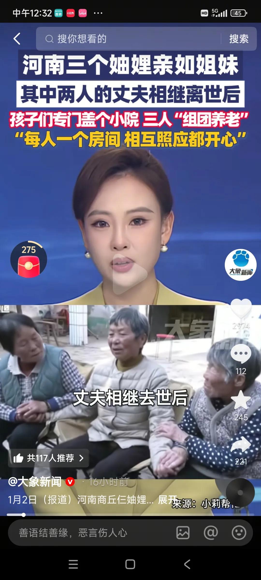 河南三位妯娌因抱团养老走红,老大媳妇82岁且老伴健在,老二、老三媳妇分别为75岁、70岁,二人老伴已离世。两位老人因子女不常回家倍感孤单,后辈们为方便照应,商量翻新老三家的房子,让三妯娌同住。三人相处和睦从未红脸,13个后辈时常回家探望聚餐,一家人其乐融融。这种抱团养老的方式收获网友好评,被赞为模范家庭。 网友评论: 亲姐妹抱团养老还容易闹矛盾呢,妯娌能处这么好,真是上辈子修来的缘分。 脾气好、少计较是基础,还得互相体谅,不揪着小事不放,这样才能长久和睦。 兄弟齐心,妯娌才会和睦,看得出来这家人的家风是真的好,根儿正。 老三媳妇最年轻,自然多照料些老大两口子,这种互相搭把手的感觉才叫一家人。 不攀比、不猜忌,有事好好说,妯娌做到这几点,比亲姐妹还亲。 现在很多家庭为鸡毛蒜皮吵翻天,这三妯娌真是给大家做了好榜样。