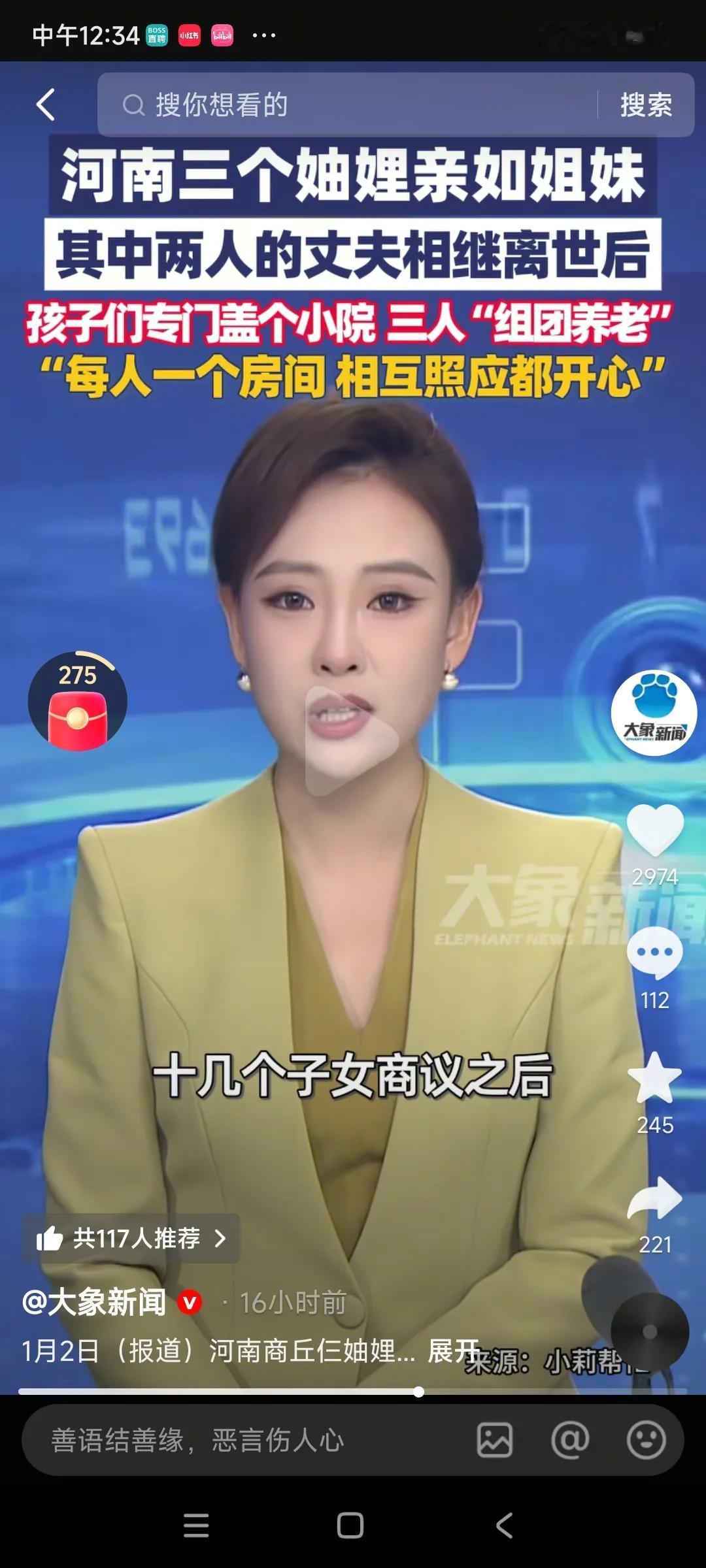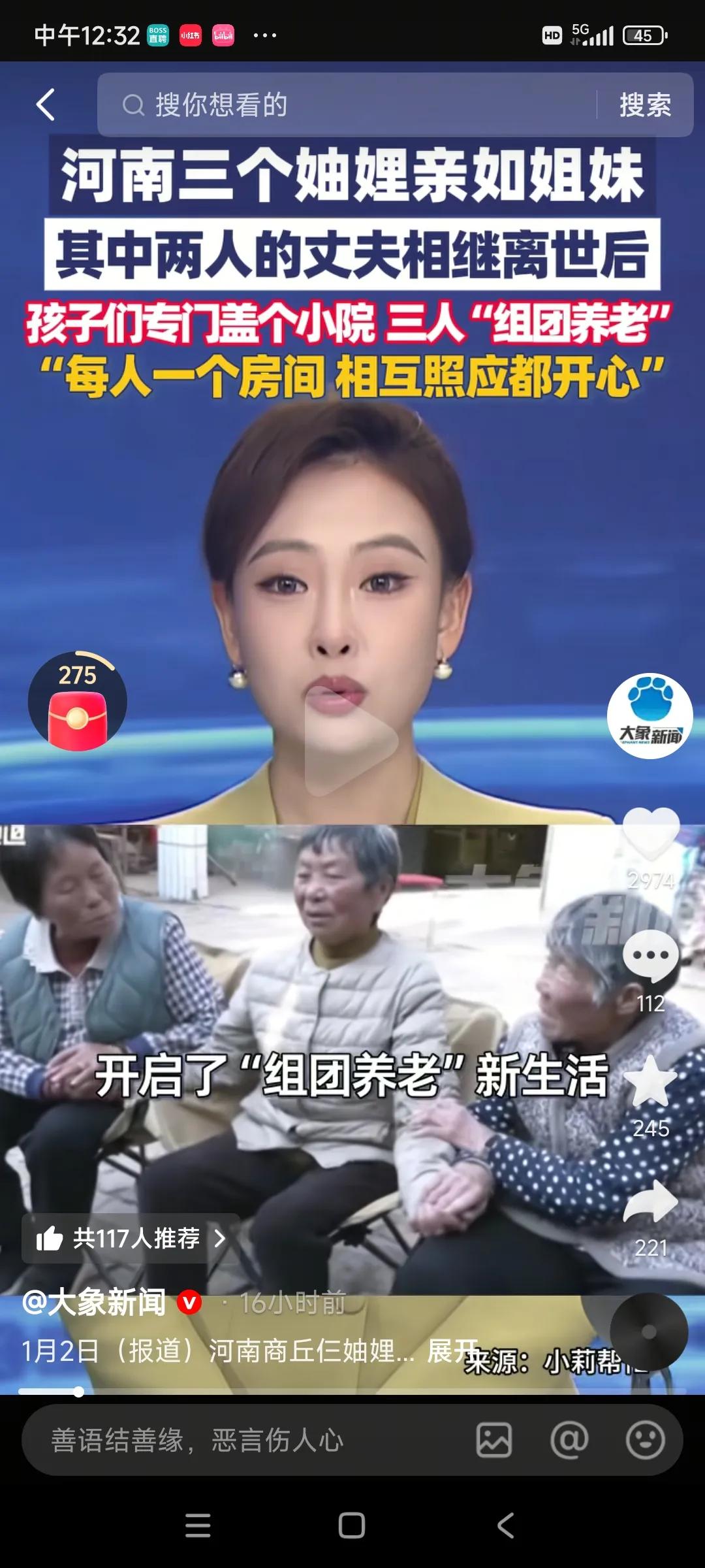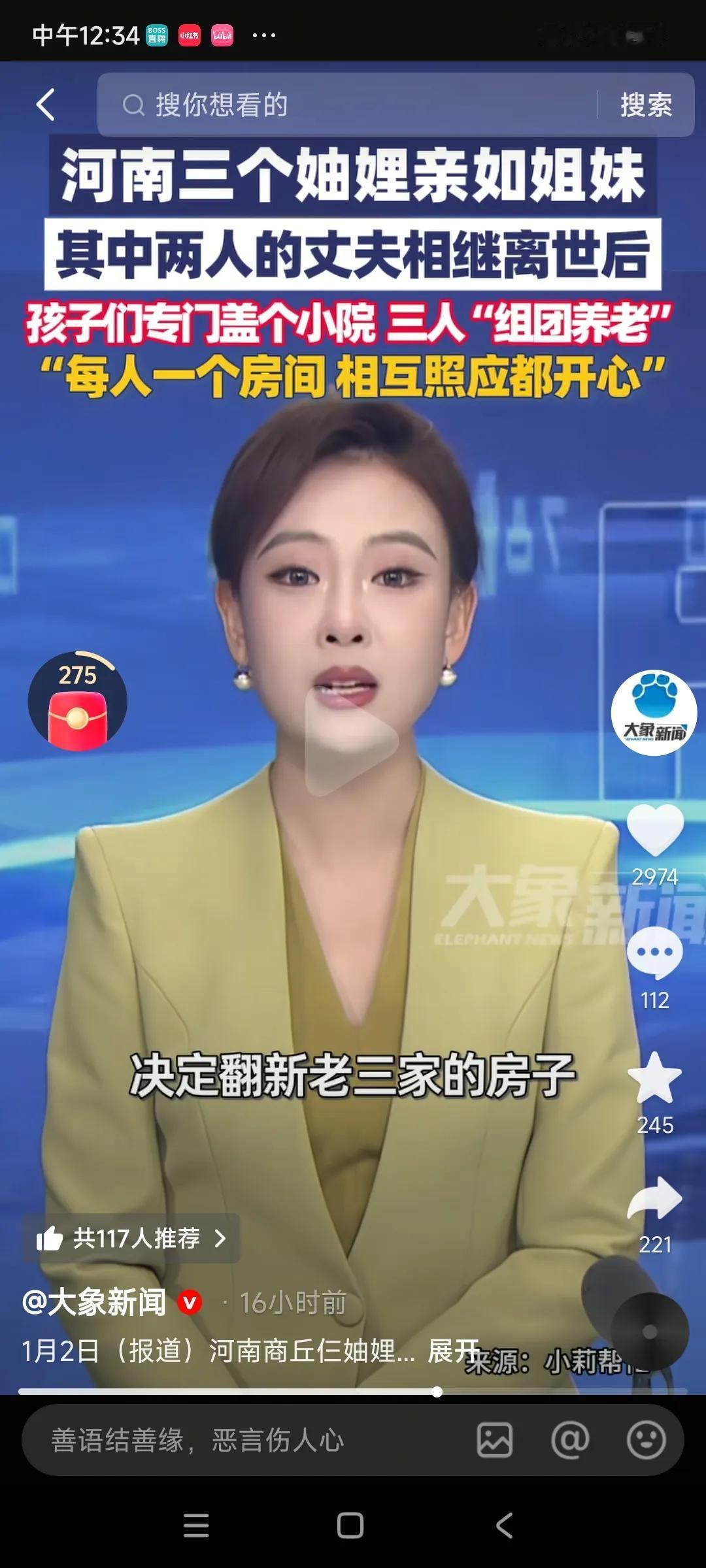河南三位妯娌因抱团养老走红,老大媳妇82岁且老伴健在,老二、老三媳妇分别为75岁、70岁,二人老伴已离世。两位老人因子女不常回家倍感孤单,后辈们为方便照应,商量翻新老三家的房子,让三妯娌同住。三人相处和睦从未红脸,13个后辈时常回家探望聚餐,一家人其乐融融。这种抱团养老的方式收获网友好评,被赞为模范家庭。 网友评论: 亲姐妹抱团养老还容易闹矛盾呢,妯娌能处这么好,真是上辈子修来的缘分。 脾气好、少计较是基础,还得互相体谅,不揪着小事不放,这样才能长久和睦。 兄弟齐心,妯娌才会和睦,看得出来这家人的家风是真的好,根儿正。 老三媳妇最年轻,自然多照料些老大两口子,这种互相搭把手的感觉才叫一家人。 不攀比、不猜忌,有事好好说,妯娌做到这几点,比亲姐妹还亲。 现在很多家庭为鸡毛蒜皮吵翻天,这三妯娌真是给大家做了好榜样。