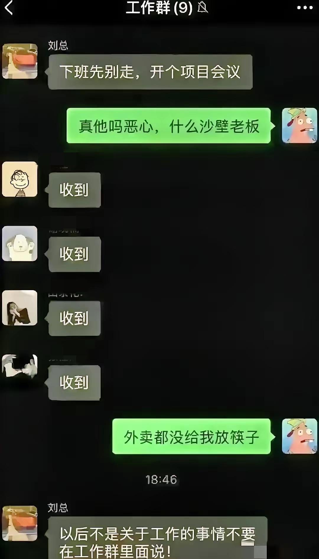 下班了开会这件事情,我想只有这位派大星头像的勇士,敢这样怼老板了吧。 我觉得尤其是在私企哈,下班开会成了常态,而且还是明明可以微信群里直接通知的事情,有些小领导可能有点官瘾,就喜欢坐在会议室第一排,看着下面的员工,发号施令,讲一些有的没的。 事实上啊,中国的会议啊,几乎都是说话发言的那个人说了算,下面顶多回复一下收到。几乎极少有敢直接在大会上持反对意见的。 因此,牛儿叫,马儿跑,牛马呢,直接喊收到,收到就好,不用开会的。