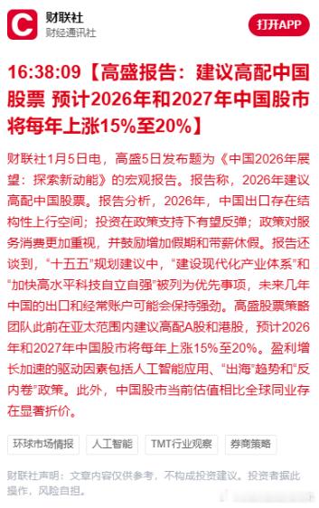 【高盛报告:建议高配中国股票 预计2026年和2027年中国股市将每年上涨15%至20%】财联社1月5日电,高盛5日发布题为《中国2026年展望:探索新动能》的宏观报告。报告称,2026年建议高配中国股票。报告分析,2026年,中国出口存在结构性上行空间;投资在政策支持下有望反弹;政策对服务消费更加重视,并鼓励增加假期和带薪休假。报告还谈到,“十五五”规划建议中,“建设现代化产业体系”和“加快高水平科技自立自强”被列为优先事项,未来几年中国的出口和经常账户可能会保持强劲。高盛股票策略团队此前在亚太范围内建议高配A股和港股,预计2026年和2027年中国股市将每年上涨15%至20%。盈利增长加速的驱动因素包括人工智能应用、“出海”趋势和“反内卷”政策。此外,中国股市当前估值相比全球同业存在显著折价。