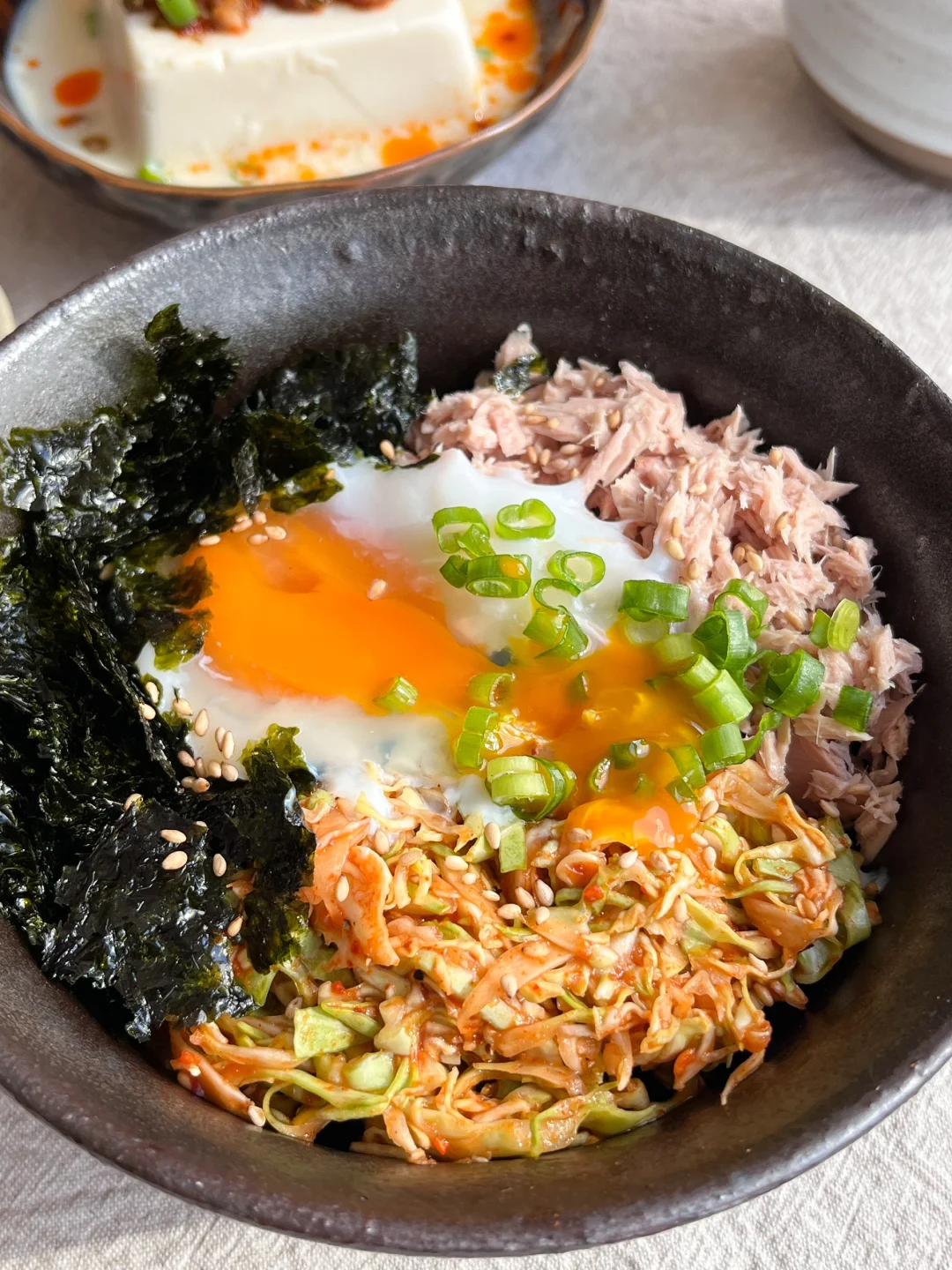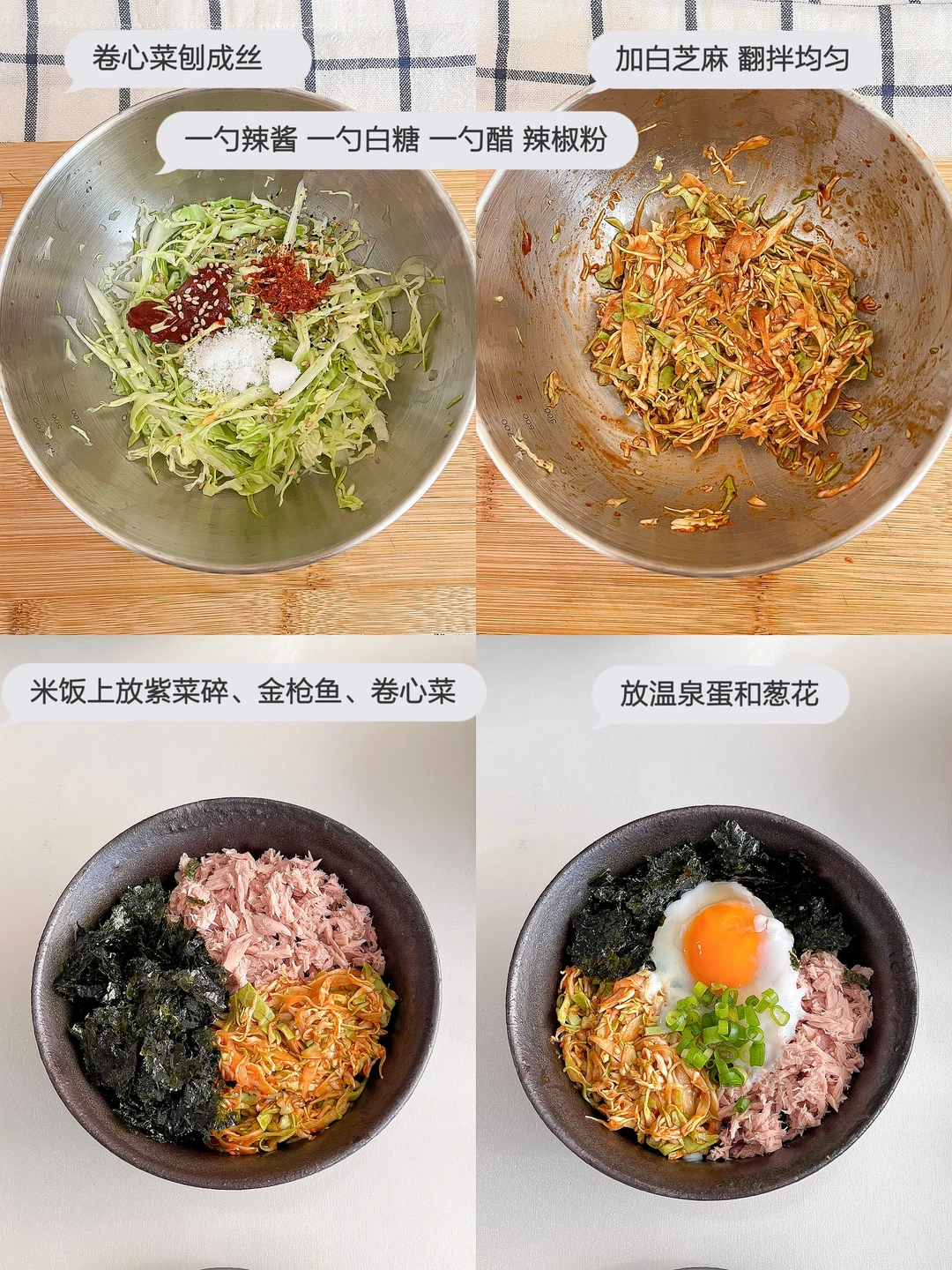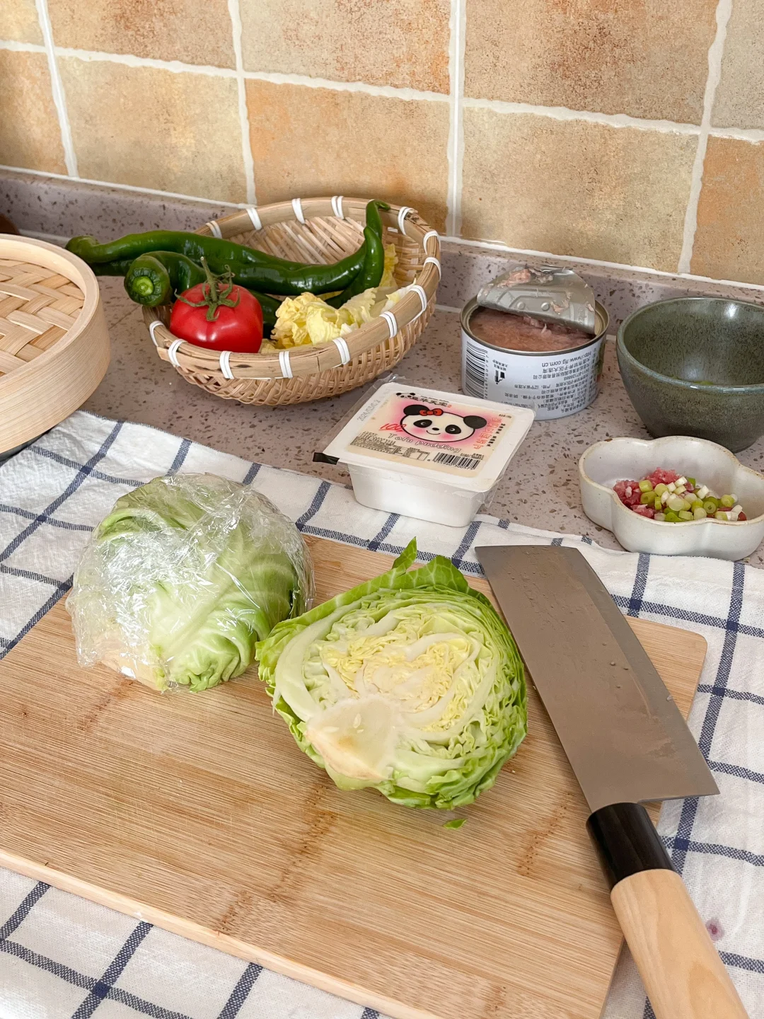 今日午餐: 包菜金枪鱼拌饭🍱 柴鱼螺丝椒🫑 辣肉沫布丁豆腐🍮 番茄白菜汤🥣 东北早市这个物价真是感人啊 今早花了💰11 买了四种蔬菜 够吃两三天了 幸福感满满~ 包菜切半 吃一半 另一半包上保鲜膜 擦成细丝 加辣酱和辣椒粉、醋、糖腌制 吃起来有点像泡菜 挺清爽 放上水浸金枪鱼、紫菜 拌上热乎乎的米饭 无油低卡又健康 米饭可以用杂粮饭