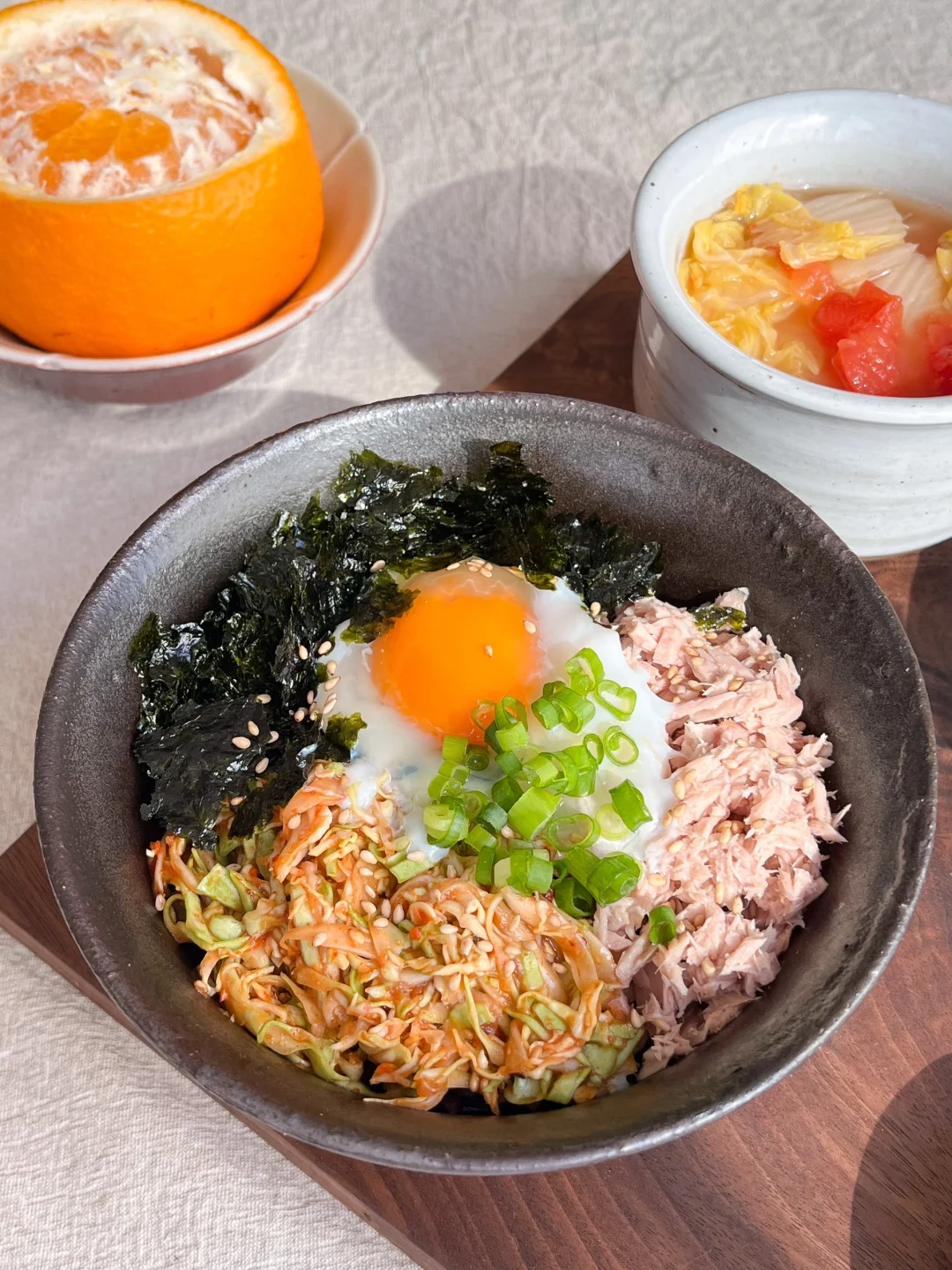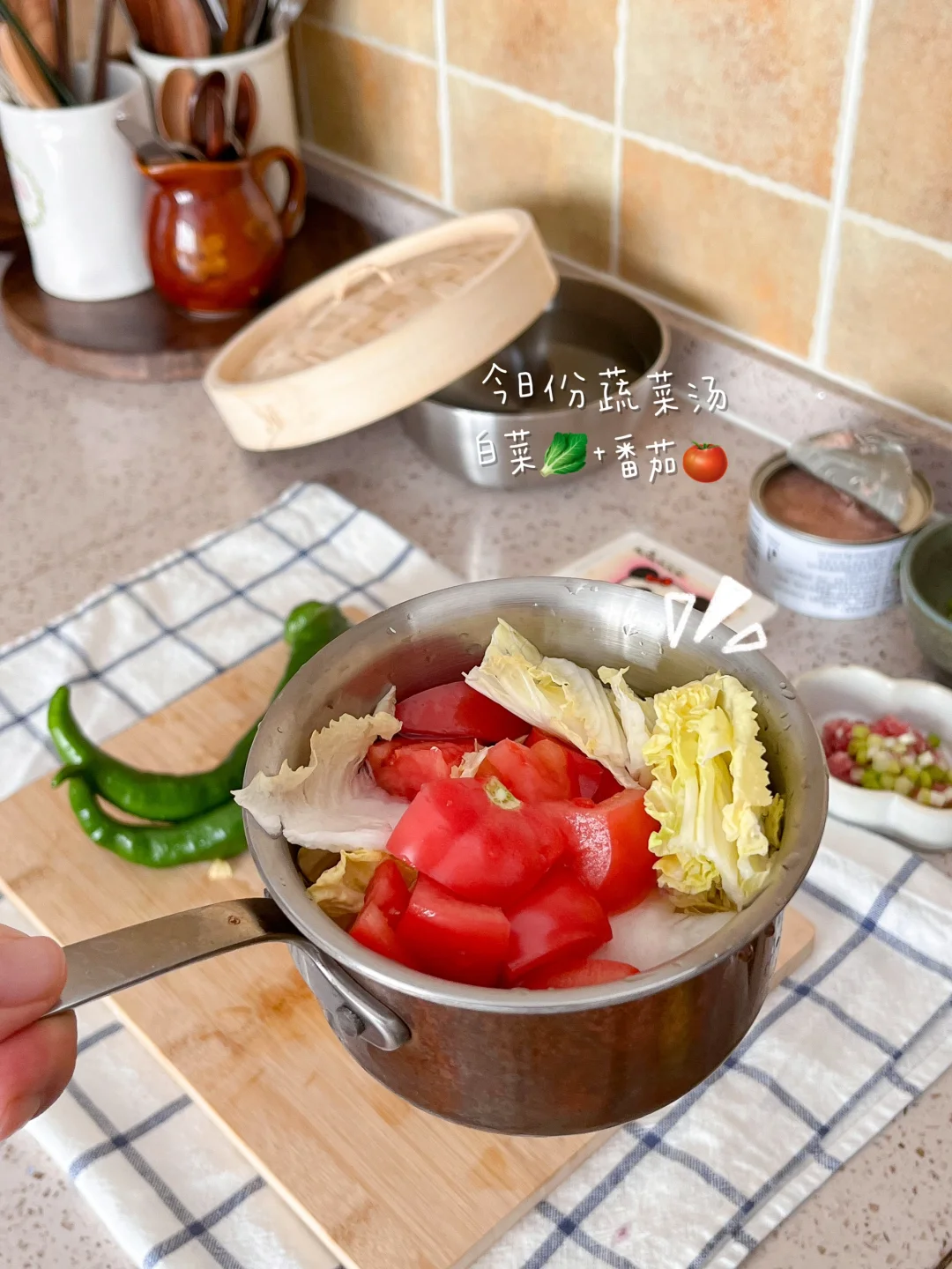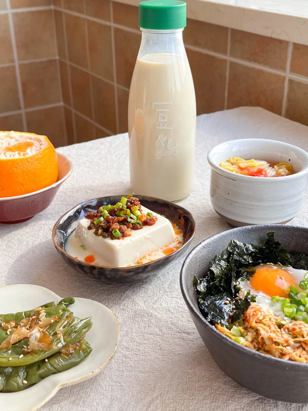 今日午餐: 包菜金枪鱼拌饭🍱 柴鱼螺丝椒🫑 辣肉沫布丁豆腐🍮 番茄白菜汤🥣 东北早市这个物价真是感人啊 今早花了💰11 买了四种蔬菜 够吃两三天了 幸福感满满~ 包菜切半 吃一半 另一半包上保鲜膜 擦成细丝 加辣酱和辣椒粉、醋、糖腌制 吃起来有点像泡菜 挺清爽 放上水浸金枪鱼、紫菜 拌上热乎乎的米饭 无油低卡又健康 米饭可以用杂粮饭