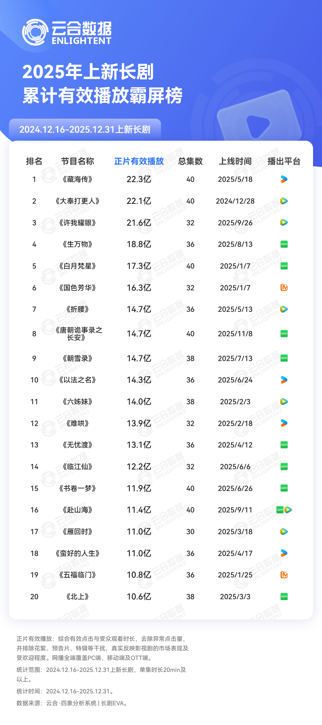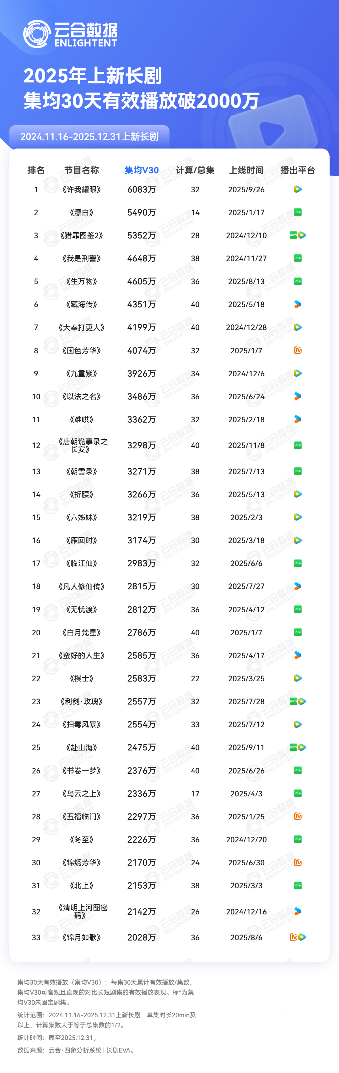 云合年度成绩单来了!热播期集均/V30/有效总播放量都在这👀你追过的剧上榜没?