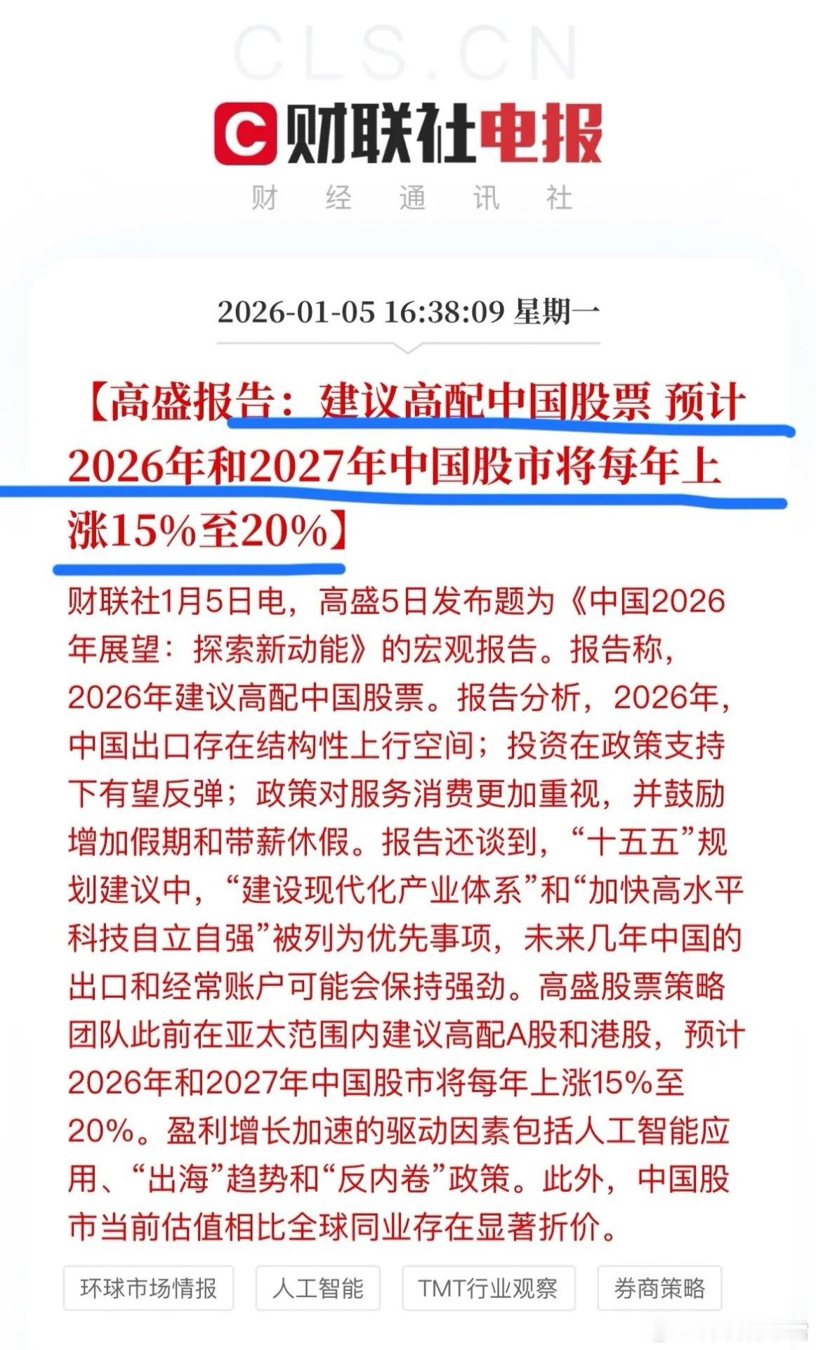 利好再加码!高盛高配中国股票,A股慢牛格局延续2026年开年迎双重利好!沪指大涨1.38%实现12连阳,强势站上4000点关口,距前高仅一步之遥,两市成交额放量超5000亿元,做多情绪高涨。盘后高盛重磅发声,建议亚太范围内高配中国股票,预测2026-2027年中国股市每年上涨15%-20%,若按此节奏,2027年A股有望冲击5000点。外资唱多背后,是中国股市慢牛逻辑的强化——估值优势、政策支持与产业升级形成共振,市场已从普涨转向结构性行情。操作上需聚焦优质赛道,谨慎择股,方能在慢牛行情中把握确定性机会。