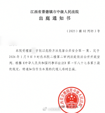 【江西#景德镇一家三口被撞身亡案将宣判#:一审开庭审理已过去200多天,曾3次延迟判决】#景德镇一家三口被撞身亡案最新消息# 2024年10月2日,江西景德镇,20岁的男子廖某宇因与女友争吵,为泄愤驾车超速至129km/h,撞上了正在过马路的一家三口,三人当场身亡,最小死者未满周岁。2025年4月15日,该案在景德镇市中级人民法院一审开庭,廖某宇被以“以危险方法危害公共安全罪“起诉。该案未当庭宣判,后经最高人民法院批准将三次延期,一审审限期延长至2026年1月20日。2026年1月5日,记者从被害人的母亲、婆婆还有奶奶——胡女士处获悉,她收到了出庭通知书,1月9日9时该案将在景德镇市中级人民法院依法公开开庭宣判。