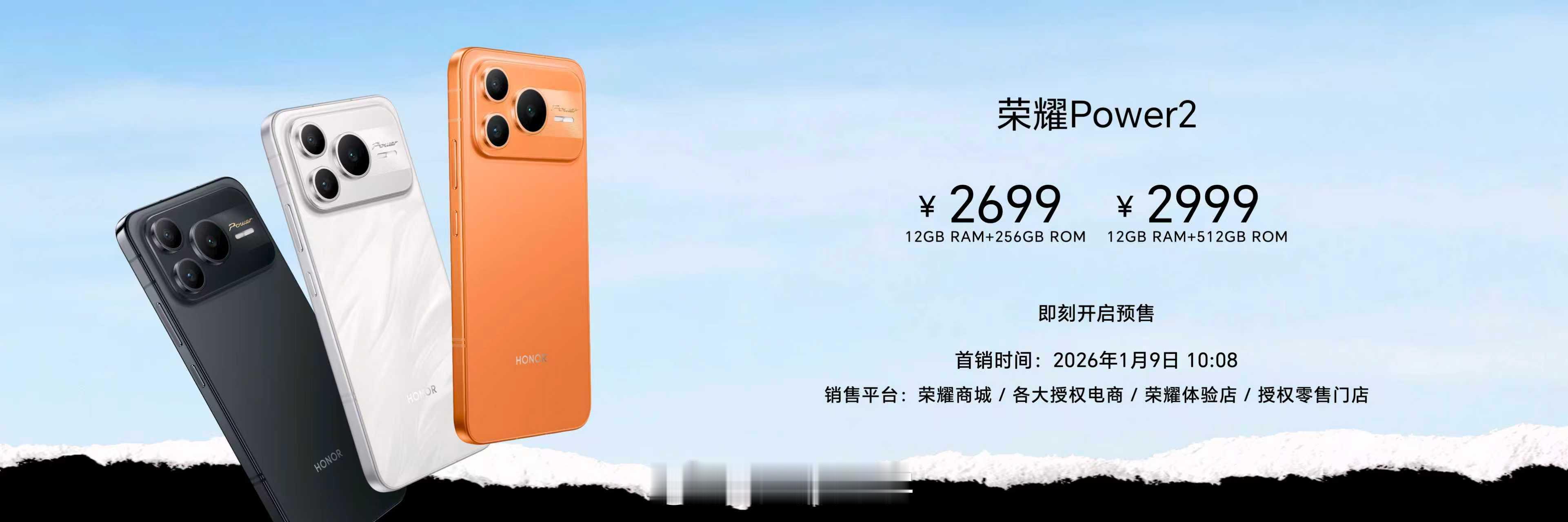 荣耀Power2 来了搭载10080mAh超大电池首发天玑8500 Elite芯片提供幻夜黑、雪原白、旭日橙三款配色推出12GB+256GB与12GB+512GB双版本国补后2294元起