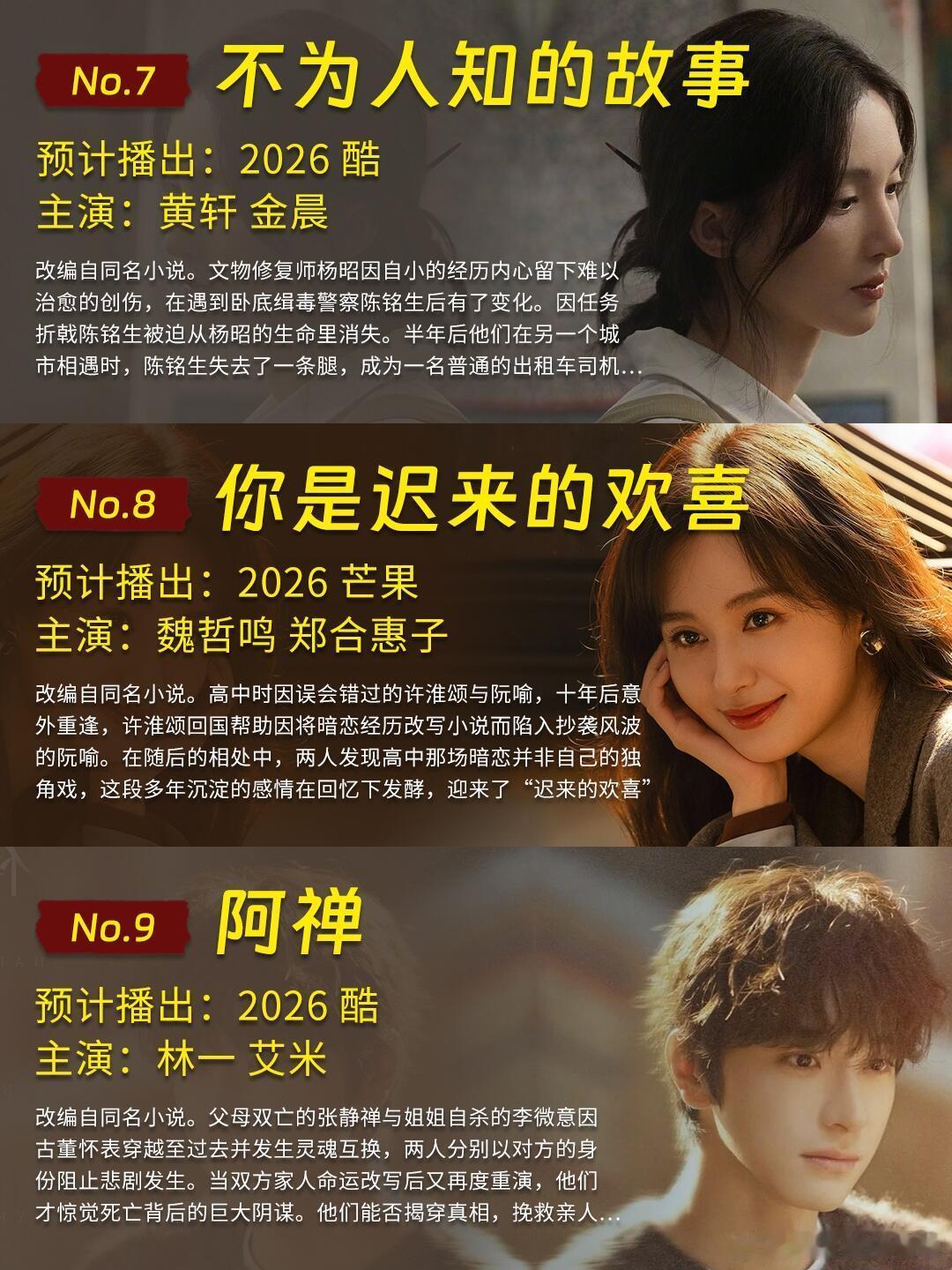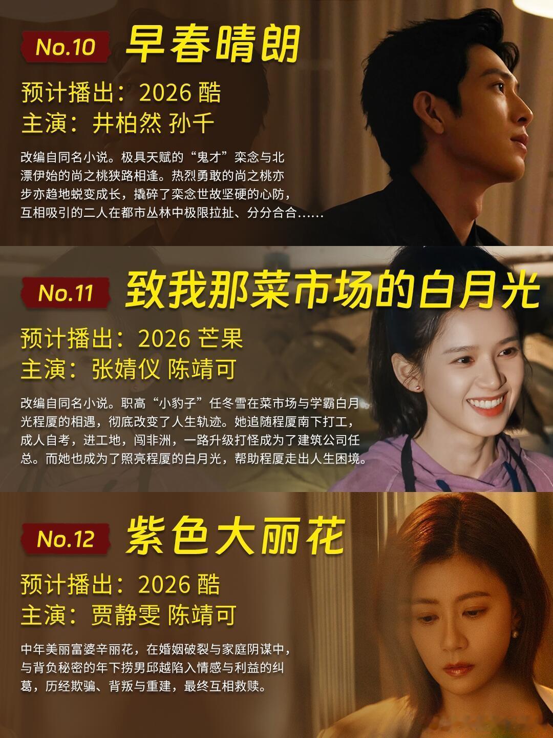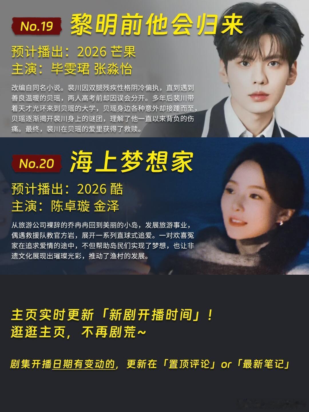 🥭👖20部2026待播现偶,你觉得哪部会爆今天是👖🥭2026待播【现偶剧、都市剧】片单盘点,🐧🥝的整理上一篇笔记已经发过啦。另外,【2026待播古装剧】也都整理了,感兴趣的可以看看哦~🥭2026现偶剧、都市剧待播:「今天是太阳雨」杨超越 董思成「野狗骨头」宋威龙 张婧仪「炽夏」包上恩 周柯宇「耀眼」关晓彤 李昀锐「欢聚」李兰迪 此沙「七月的一天」沈月 陈昊森「你是迟来的欢喜」魏哲鸣 郑合惠子「致我那菜市场的白月光」张婧仪 陈靖可「大梦想家」沈月 吴汉坤「飞到我心上」魏哲鸣 刘些宁「花好」周依然 王子奇「黎明前他会归来」毕雯珺 张淼怡👖2026现偶剧、都市剧待播:「不为人知的故事」黄轩 金晨「阿禅」林一 艾米「早春晴朗」井柏然 孙千「紫色大丽花」贾静雯 陈靖可「她的瞳」黄曦彦 邢菲「以你为名的夏天」翟潇闻 吴施乐「盛夏缤纷」侯雯元 娜然「海上梦想家」陈卓璇 金泽