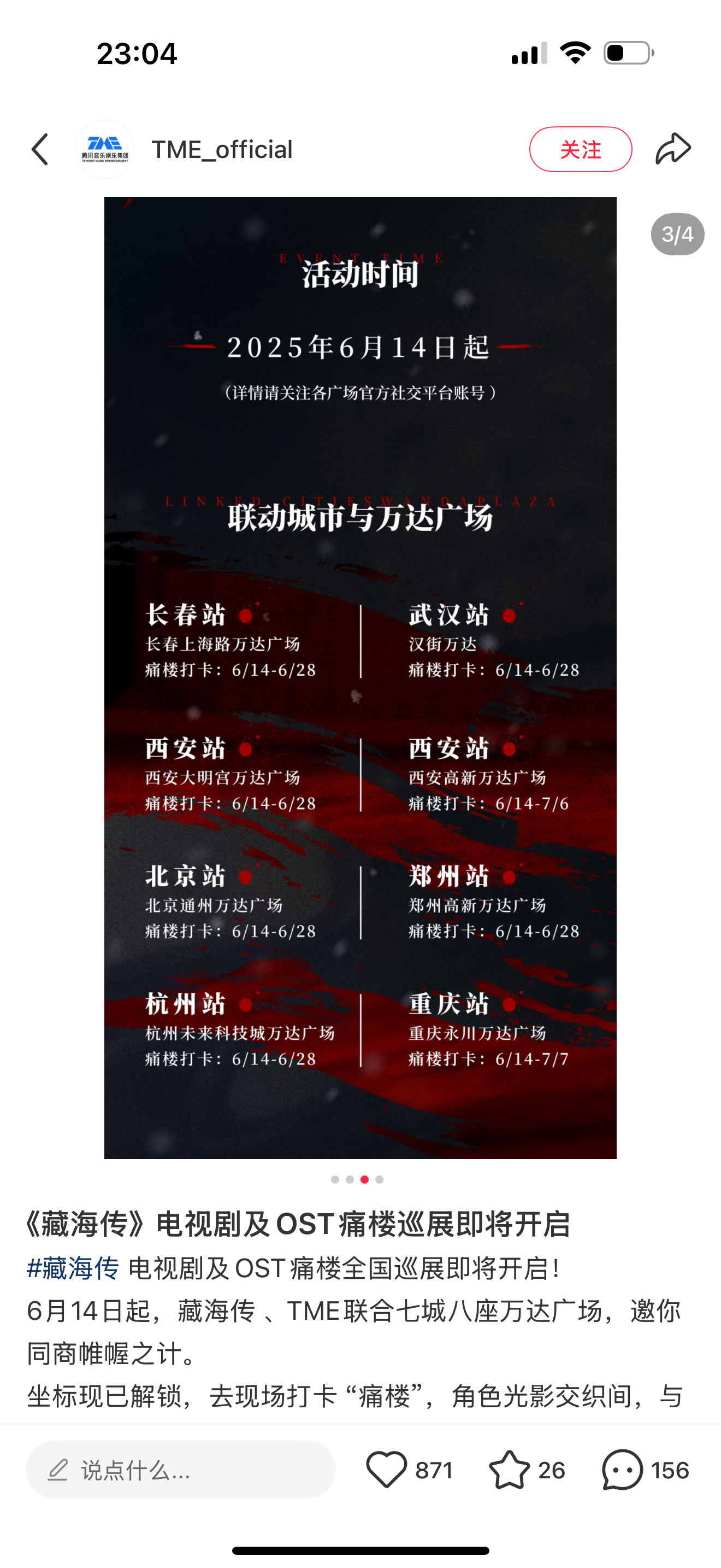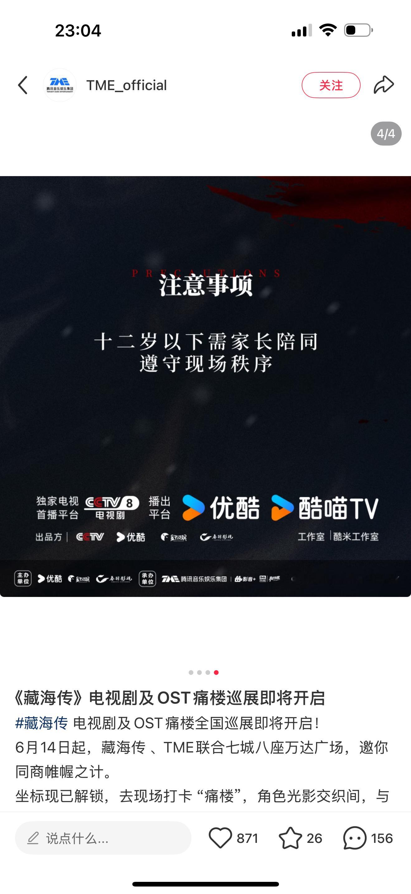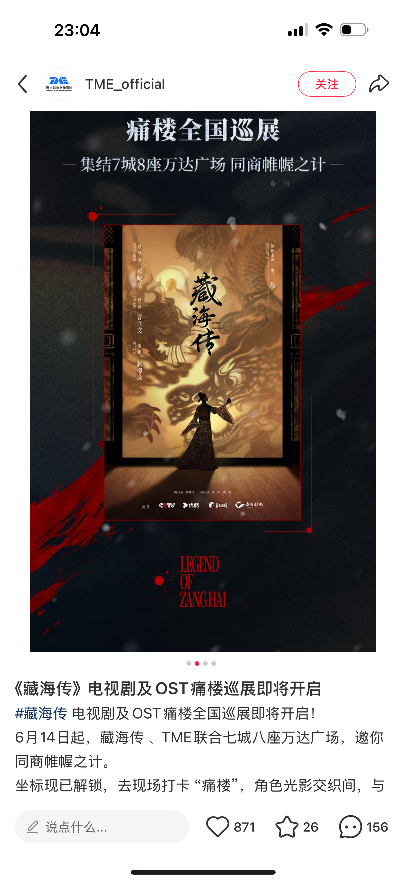 对不起,因为《藏海传》太爆了,被夸的地方太多太多,边边角角的东西真没注意,我都不知道“腾讯音乐”联合优酷做过全国痛楼巡回展(知道有痛楼但不知道谁举办的,爆剧的烦恼),而且巡演城市是北上广这些超一线城市,有八个地方。(不止腾讯音乐六月办过,我看五月也有,不晓得裤子跟谁弄的)