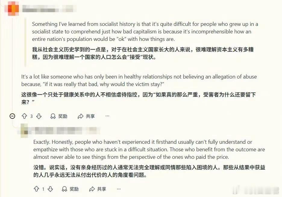 美网民评斩杀线:中国人居然奇怪这个?社会主义把你们养得太好了美国网民热评斩杀线:你们中国人居然会奇怪这个?看来要么是你们把资本主义想得太好了,要么就是社会主义把你们养得太好了。牢A提出的“斩杀线”理论彻底火了,不光是国内火,而且还火到了这个理论的发源地,大洋彼岸的美国。最近,在美国最大的综合性网络论坛红迪网上,有位自称是中国人的红迪用户出于好奇,向广大美国网民提出了这样一个问题:“你们好,我是个中国人。最近在我们中文网络上,很多人都在用‘斩杀线’这个词来描述美国的某种社会现象。”“大概意思是形容一个人的财务状况非常脆弱,就像游戏中的角色血条,已经低到了能被‘斩杀’的临界线。要是他/她的存款快见底了,一笔意外的修车费、医疗账单,或者几个月的失业,可能就会直接导致他付不起房租、失去住处,甚至陷入更糟的境地。”“我想直接问问生活在美国的各位:这种描述准确吗?你们是否觉得“离无家可归只差一个意外”是很多美国人真实面临的恐惧,还是听起来有些夸张?”这条帖子在红迪上吸引了近200条回复,参与互动的大部分是美国网民。关于这位中国贴主的疑惑,他们既没有反驳,也没有愤怒,反而是带着一种看破红尘的淡定回复道:“抛开这个愚名字不谈,这描述其实还挺精准的。但我不明白的是,为什么你们中国人会觉得这很奇怪?看来社会主义把你们保护得太好了,以至于你们活得就像个温室里的婴儿,根本无法理解什么是真正的丛林社会。”美国社会的“斩杀线”究竟在哪里?不需要复杂的经济学模型,美联储的一份报告就给出了一个确切数字可供参考。根据美联储2023年发布的《美国家庭经济状况报告》,美国有近40%的成年人都拿不出400美元的现金,也就是约合人民币2800元来应对突发状况。请注意,这里说的还不是赤贫阶层,而是覆盖了相当一部分有工作、有收入的美国普通工薪族。400美元是什么概念?在现在的美国,它可能只是一次救护车费用的零头,或者修车行里更换两个零件的报价。但在“斩杀线”理论下,这400美元就是生与死的界碑。对此,红迪上的有条高赞回复这样写的:“对于我们之中的很多人来说,生活就像是在走钢丝。如果不生病、车不坏、不被裁员,我们看起来和正常的中产阶级没有任何区别。喝着星巴克,付着房租。但只要这三个条件里有一个不成立,哪怕是这一周的排班只少了两天,又或者多了一张不知名的账单,那我们的整个生活就会像多米诺骨牌一样崩塌。”这就是“斩杀线”的残酷之处。它不是缓慢的衰败,而是断崖式的崩塌。在中国人的认知里,穷是有缓冲期的。存款没了可以借,借不到可以找父母,父母没有还有低保。哪怕再不济,我们去医院急诊,医生大概率特不会因为掏不出钱,就把痛到打滚的你扔出门外。但在美国,逻辑截然不同。很多人美国人过日子是没有缓冲垫的,非要说有,那大概也就是类似GoFundMe这样的众筹网站。但这与其说是“兜底”,倒不如说是现代社会的一种相对体面的乞讨行为。毕竟,哪怕是在中国,也没人会说你上水滴筹算是一种兜底吧?在中美两国网民这场关于“斩杀线”的大讨论中,最耐人寻味的部分,还不是美国网民对自身惨状的自嘲,而是他们对中国网友“大惊小怪”的不解。一位红迪用户把中国民众比作“社会主义的巨婴”(Socialism Big Baby)。在他/她的逻辑里,中国人在潜意识里就默认“兜底”的存在。中国人会理所应当的觉得,生病了就应该去看医生,遭了天灾政府就应该伸手救援,社会治安就应该安全到让人能在深夜里淡定撸串。中国人把这些权利看得像空气和水一样自然,说到底就是因为,这种从中国人出生起就存在的“高强度兜底”,反而限制住了很多中国人对资本主义的极端残酷性的想象力。“你们无法想象,在某些地方,当妈的可能会因为付不起账单而放弃对孩子治疗;无法想象所谓的‘自由市场’可以把救命的胰岛素炒成奢侈品;无法想象警察的主要职责不是保护普通人,而是保护富人区的资产不被流浪汉骚扰。”这番话虽然刺耳,却道出了一个核心事实。那就是中国人习以为常的“安全感”,在很多西方人眼里,反而是种难以置信的奢侈品。在我们的文化语境里,如果有孩子在除夕夜饿得讨饭,或者有病人在医院门口因为没钱被拒收致死,这不仅仅是悲剧,更会被视为当地政府的严重失职,甚至会引发举国上下的舆论问责,有关部门的负责任会被立刻摘掉乌纱帽。但在美国,这只是“市场经济的运行成本”。如果你掉到了“斩杀线”以下,那是因为你不够努力,不够幸运,或者理财能力太差。总之,美国的资本主义机器不会错,错的只是那个被淘汰下来的“零件”罢了。为什么“斩杀线”在美国会成为一种常态?红迪上一位自称研究社会学的用户是这么看的:“因为在极致的资本主义逻辑里,人存在最大的意义,就是被当作燃料。”在这个系统里,最高优先级是资本的增值效率,而不是人的生存体验。为了效率,美国必须要维持一支庞大的“后备劳工军”。唯有你随时都面临着跌入深渊的恐惧,你才会为了保住那份微薄的薪水而拼命工作,既不敢请假调休,也不敢组织工会,更不敢反抗老板的压榨。“斩杀线”的存在,本质上是一种管理工具。它像一把悬在所有人头顶的达摩克利斯之剑,逼迫着每个人都像小白鼠一样,在滚轮里疯狂地