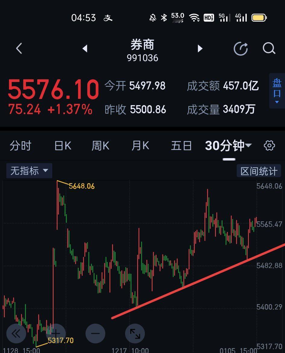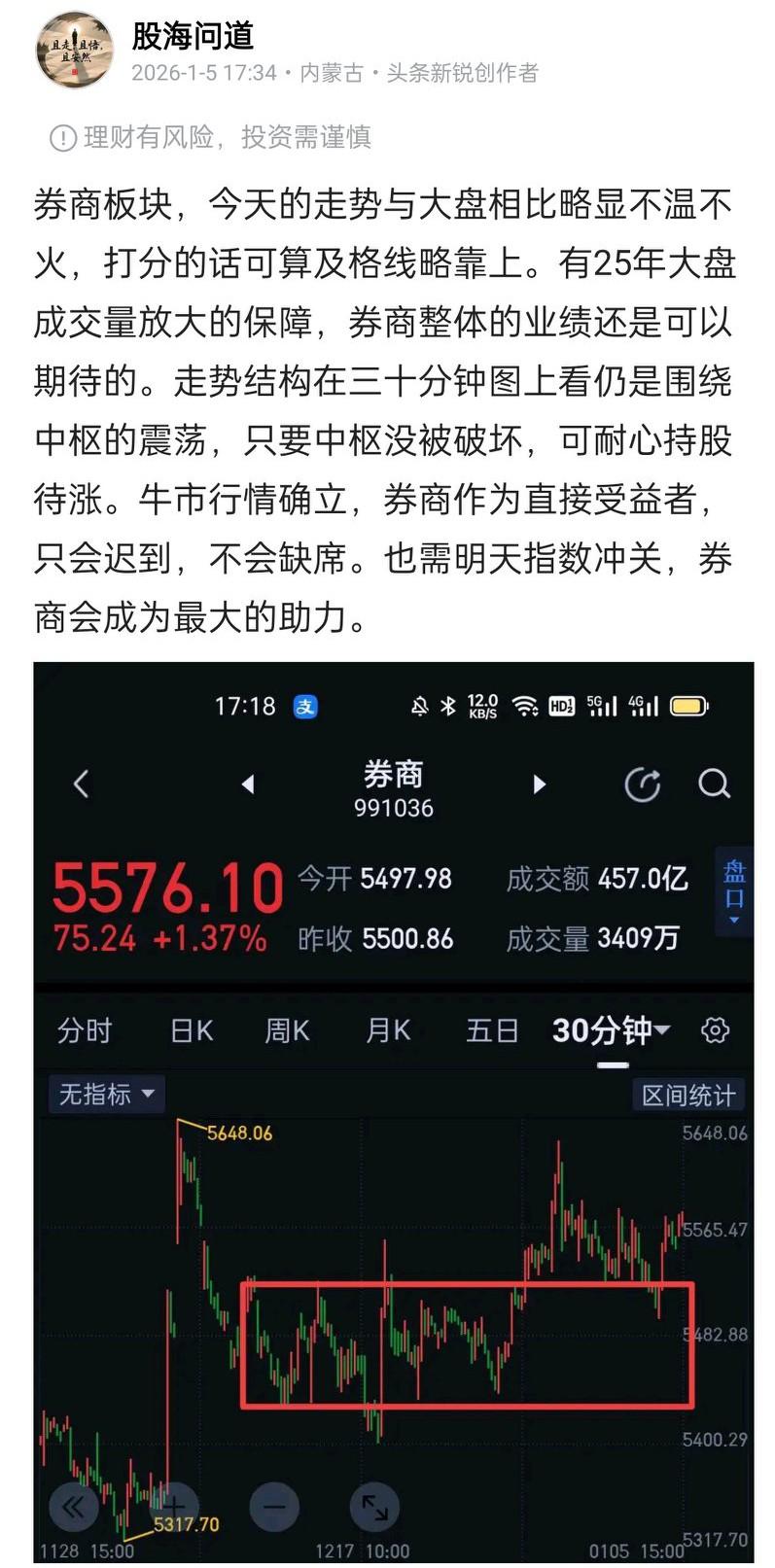 昨天对券商板块的表述不够全面,今天做一及时补充。三十分钟图上券商走势仍是围绕中枢的震荡,但如果一分为二的看,券商走势也有积极的一面,17号之后的结构是低点逐渐抬高、高点也不断抬高的过程,只要支撑线不破坏,券商的上涨趋势将会保持。