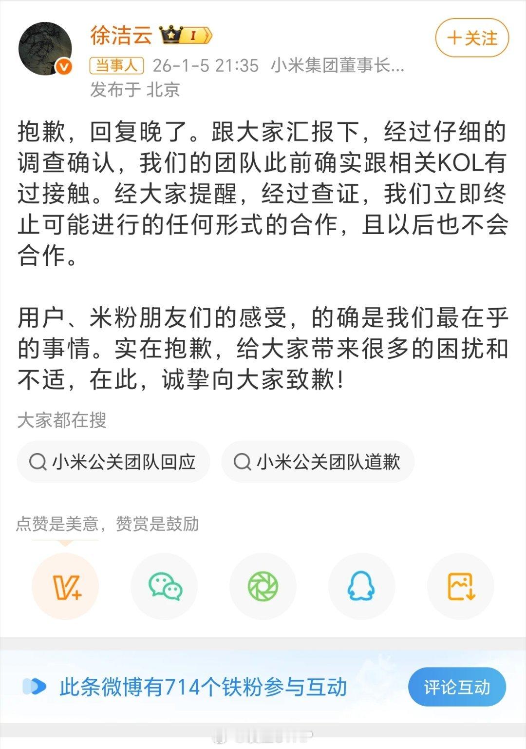 大熊 小米后续 徐洁云回应小米投放大熊徐洁云致歉:有过接触,立即终止可能的合作,以后也不会合作。