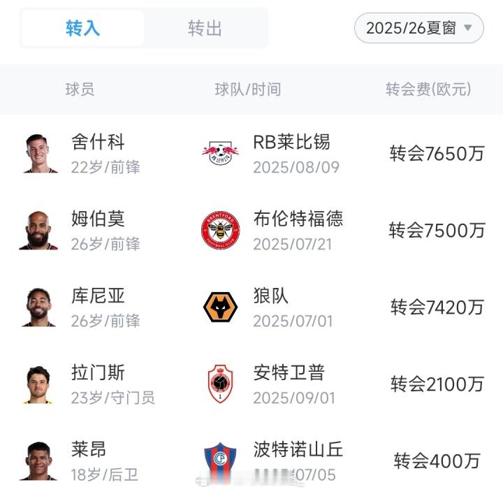 几人亏几人赚?阿莫林执教曼联一年时间,阿莫林在两个转会窗中签下7名球员,花费2.825亿欧元。2024/25赛季冬窗:多尔古,3000万欧元海文,180万欧元2025/26赛季夏窗:舍什科,7650万欧元姆伯莫,7500万欧元库尼亚,7420万欧元拉门斯,2100万欧元莱昂,400万欧元