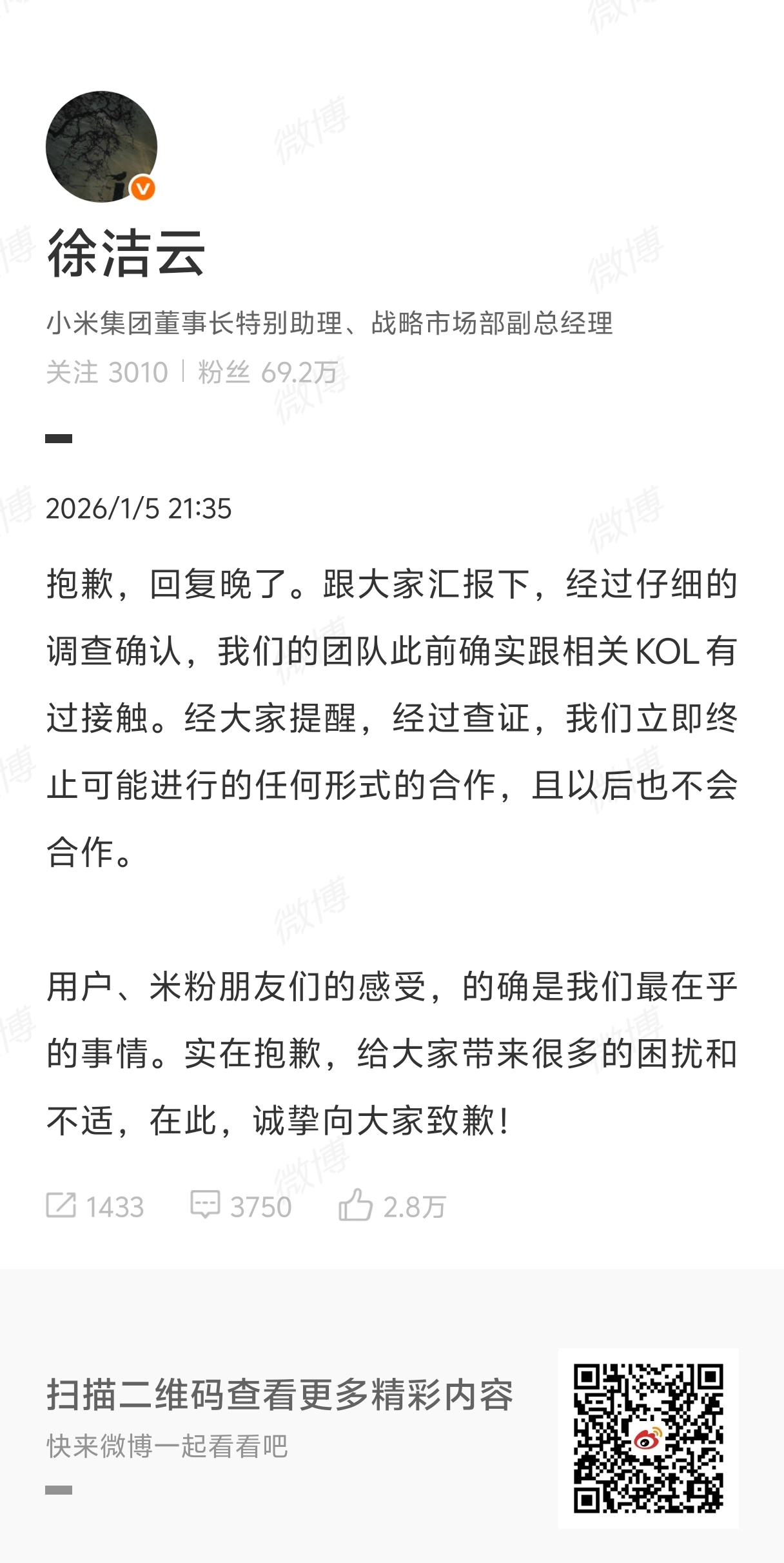 小米立即终止与相关KOL合作我就说,你以为有内鬼,其实只不过大家都是草台班子,审核不严而已,之前某家也发生过,好像是个什么女博主来着